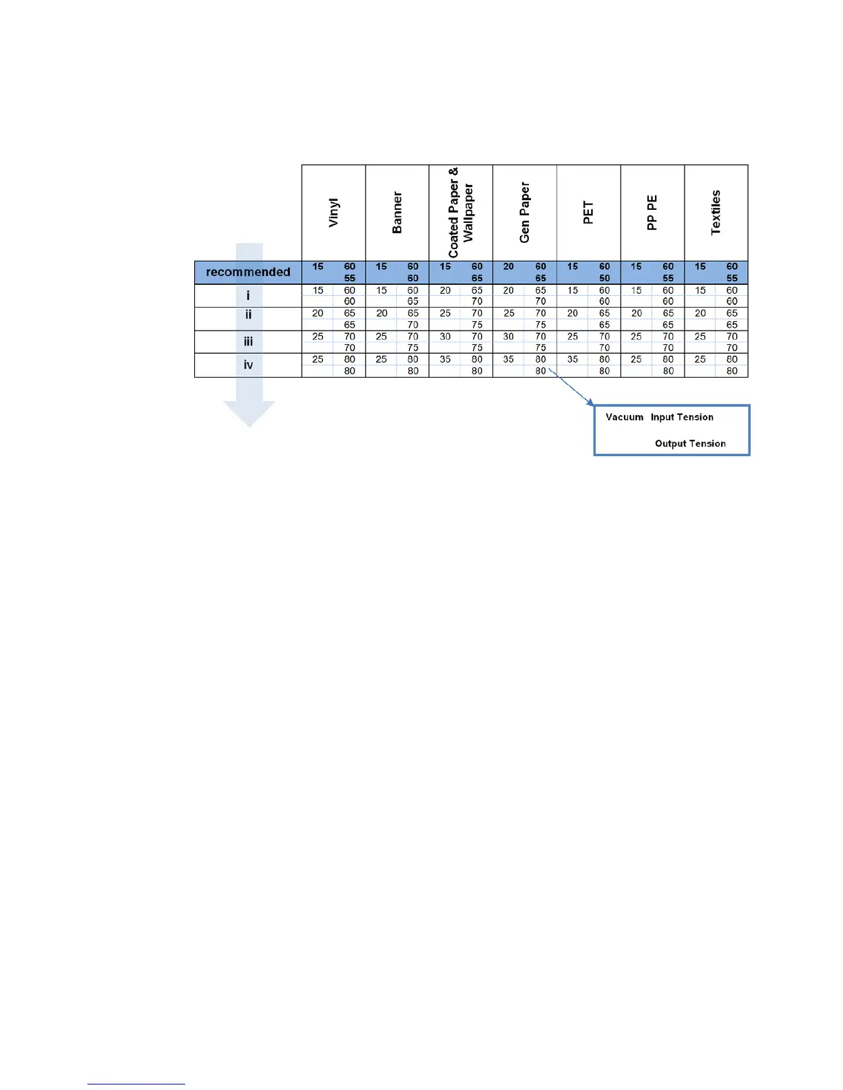 5. Increase vacuum and tensions step by step (i to v) following the table below, until you find settings that