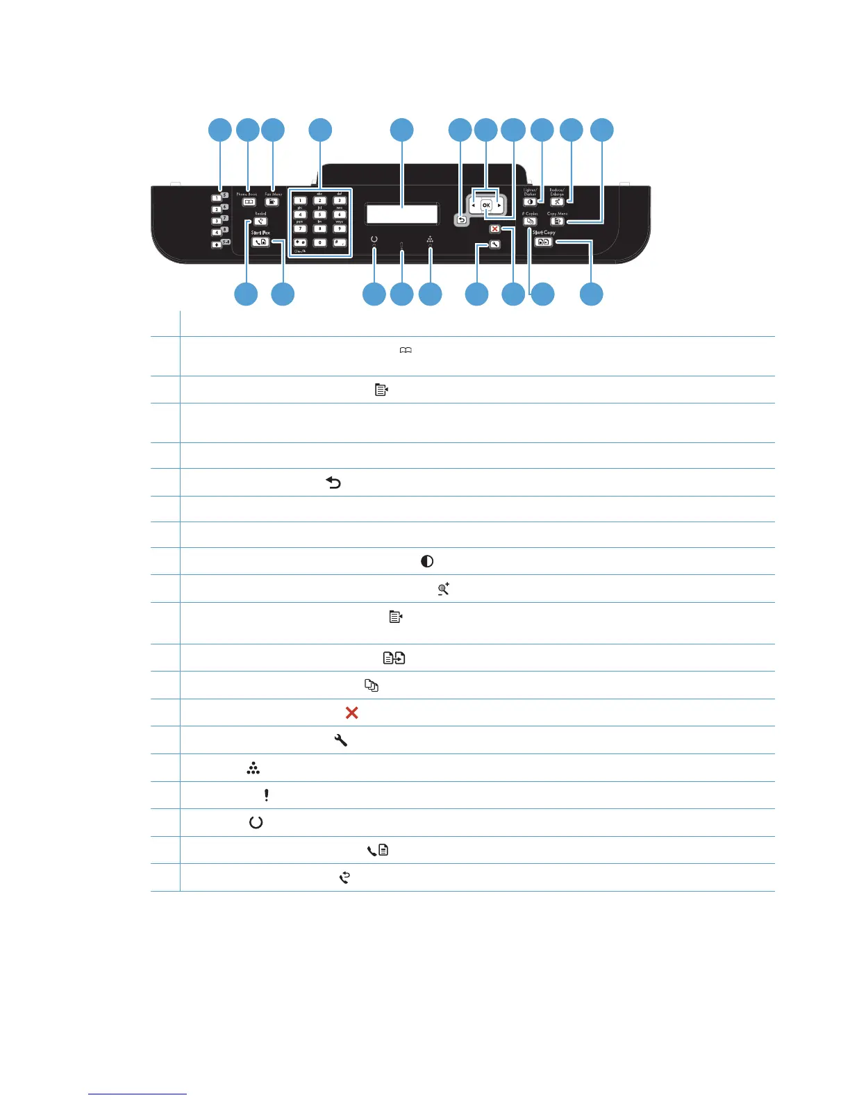 16 Toner light . This light indicates that the print cartridge toner level is low.