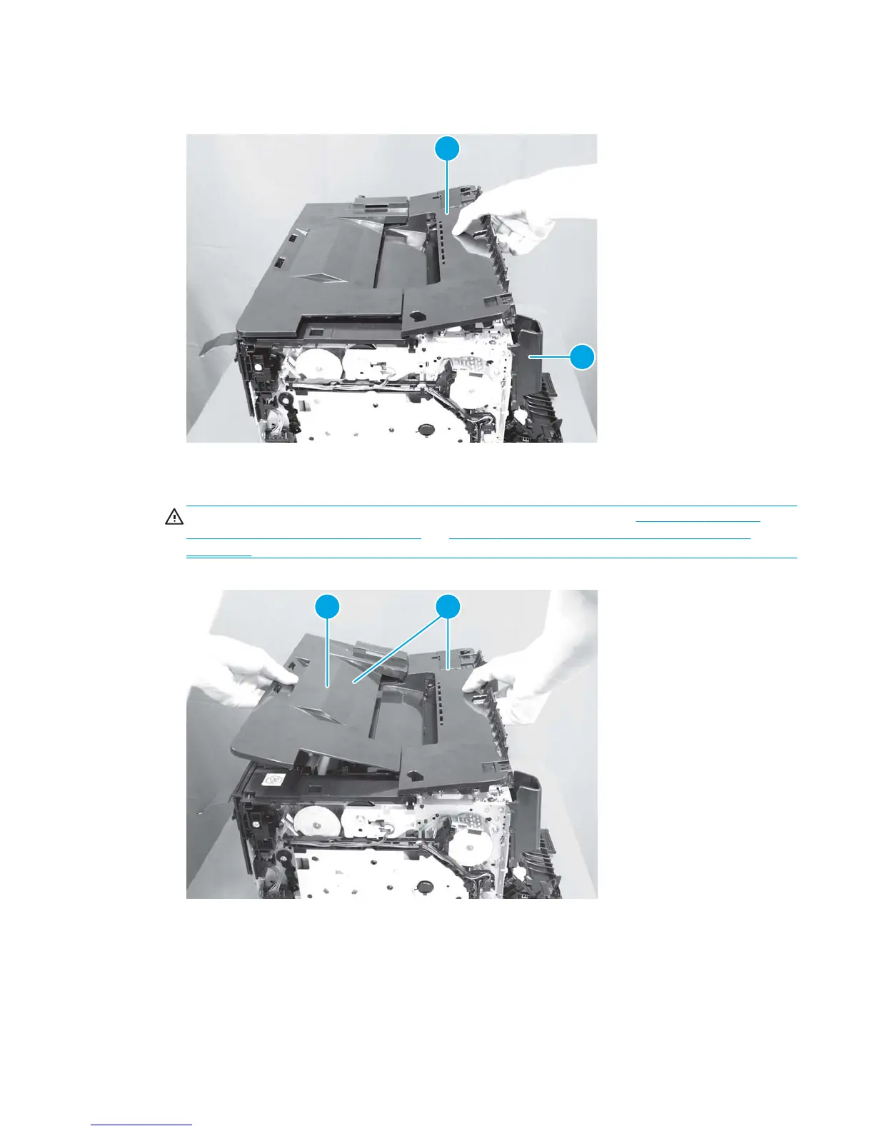 6. Lift the top cover (callout 1), and then slide the top cover (callout 2) toward the front of the product to