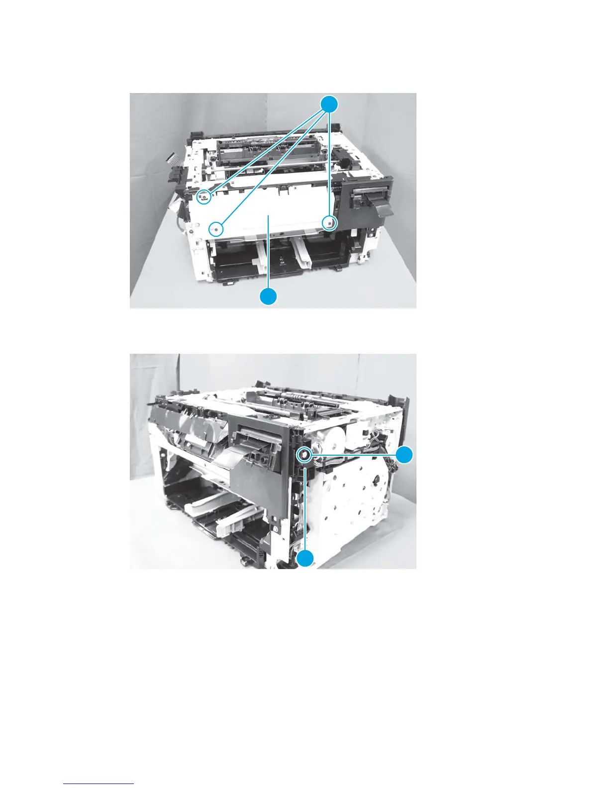 2. Remove three black screws (callout 1) and the scanner cover (callout 2).
