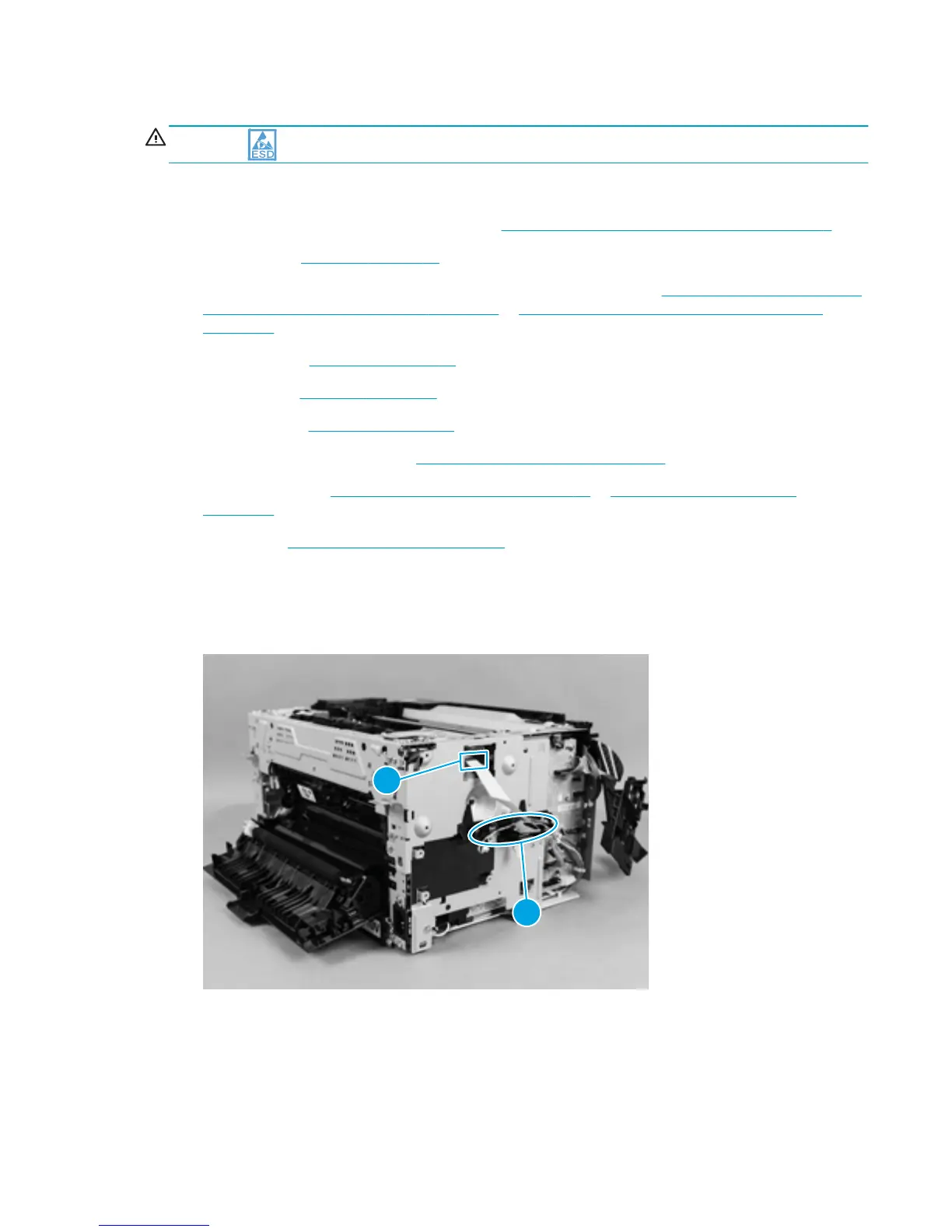 1. Disconnect the formatter-engine FFC (callout 1) and release the cables from the cable guides (callout 2).