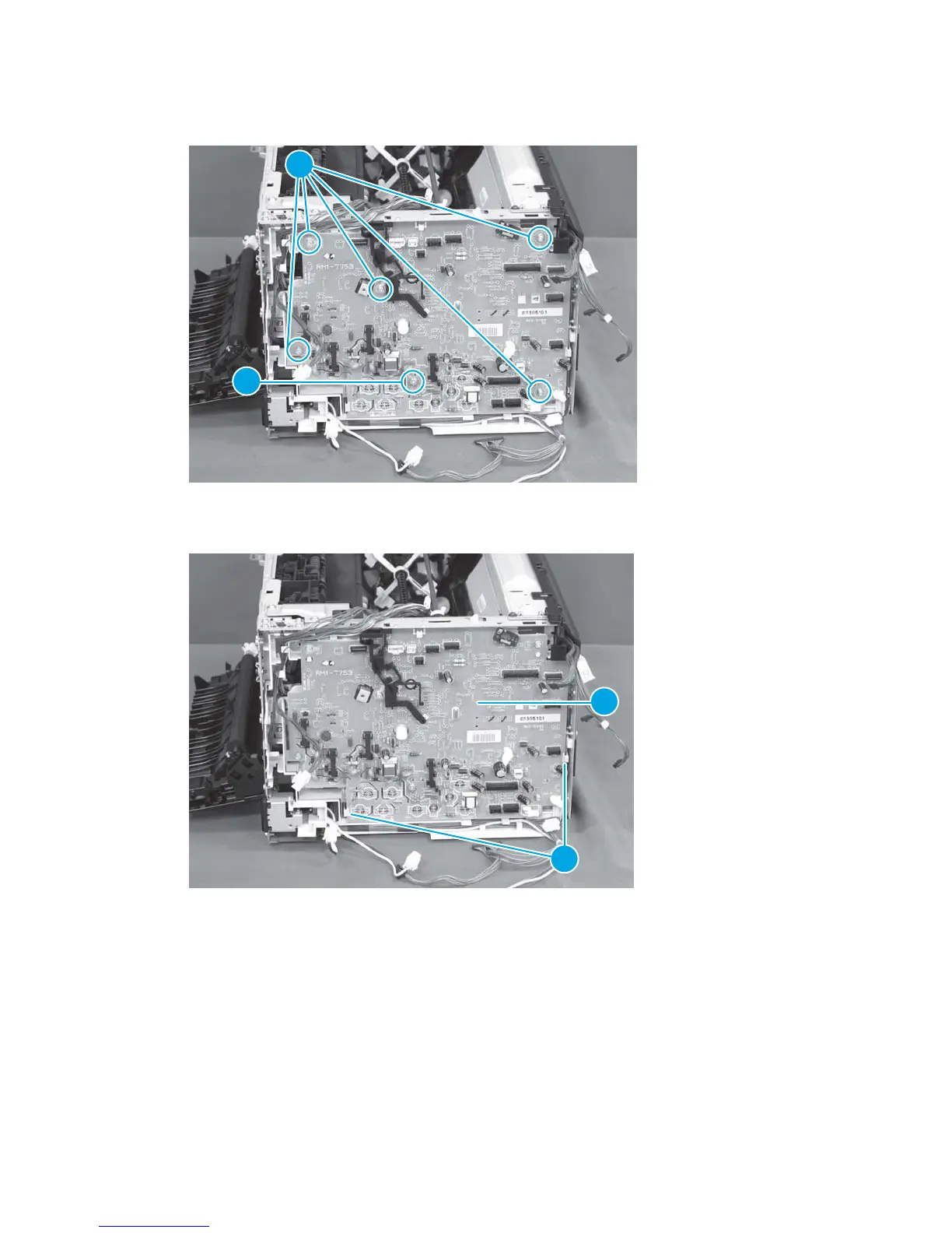 6. Remove five screws with washer (callout 1) and one tapping screw (callout 2).