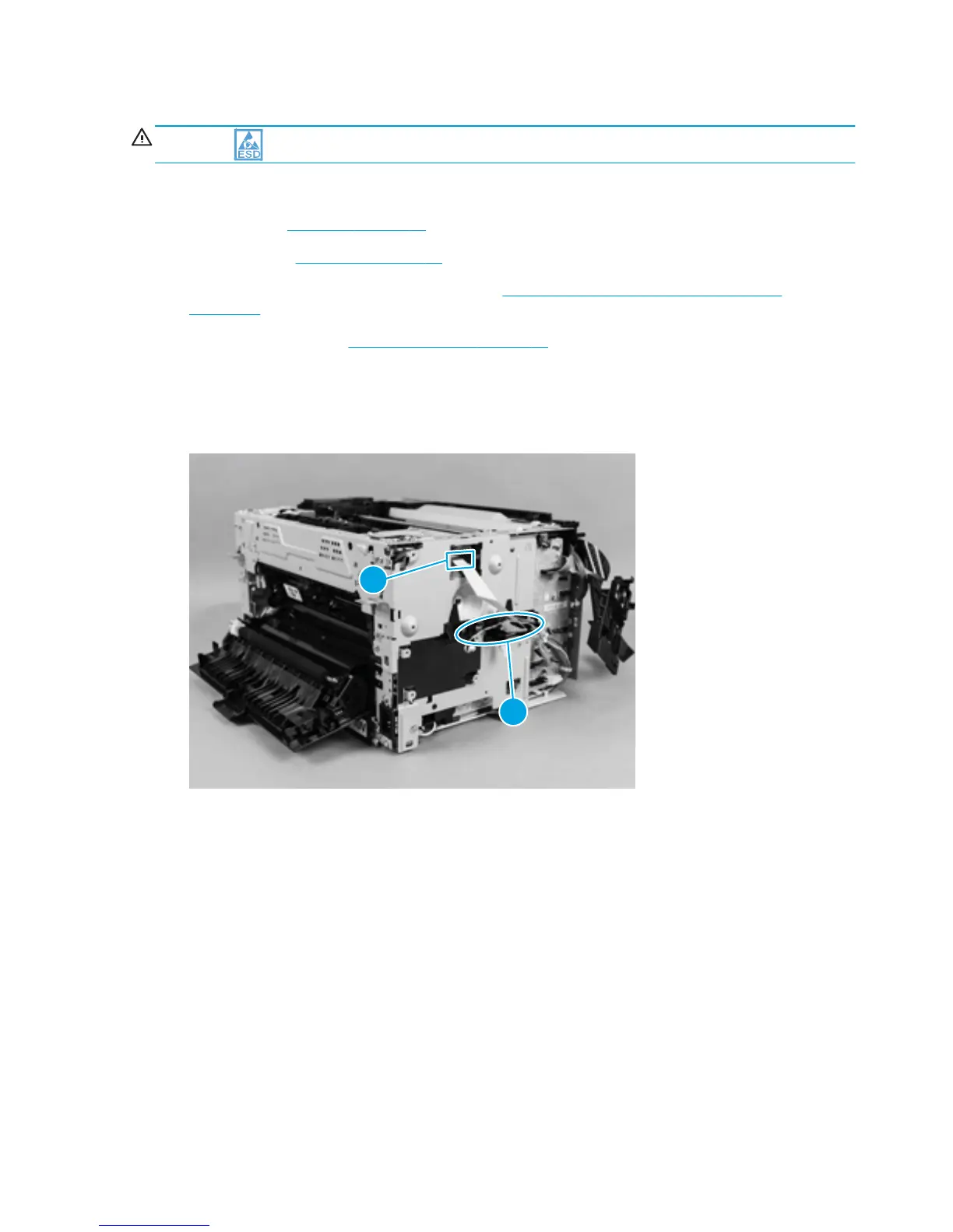 1. Disconnect the formatter-engine FFC (callout 1) and release the cables from the cable guides (callout 2)