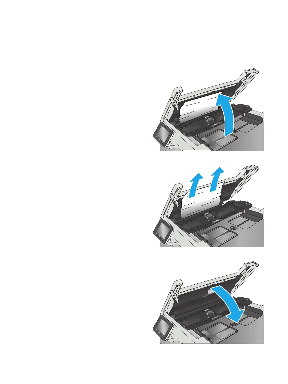 The following information describes how to clear paper jams in the document feeder. When a jam occurs, the