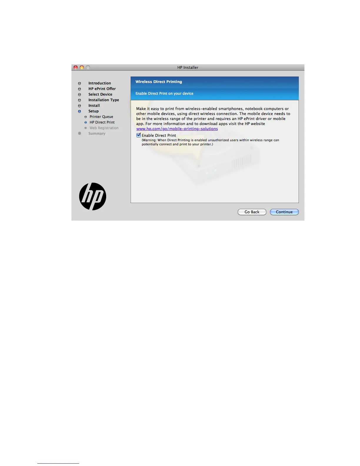 15. To install HP ePrint, in the Wireless Direct Printing screen, click the Enable Direct Print