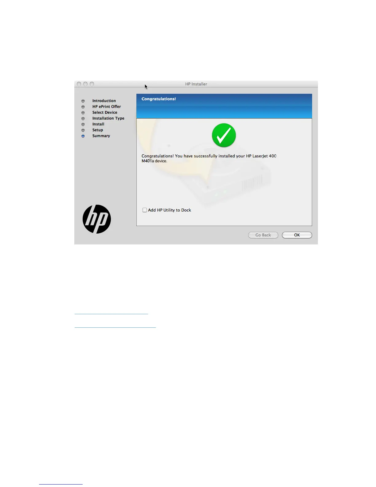 17. When the installation completes, the Summary screen appears. To add the HP Utility icon to