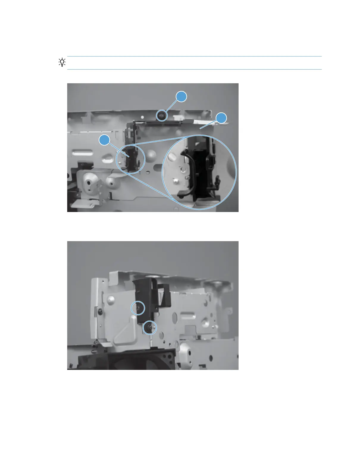 3. Remove one screw (callout 1), the wire harness holder (callout 2), and the sheet-metal bracket