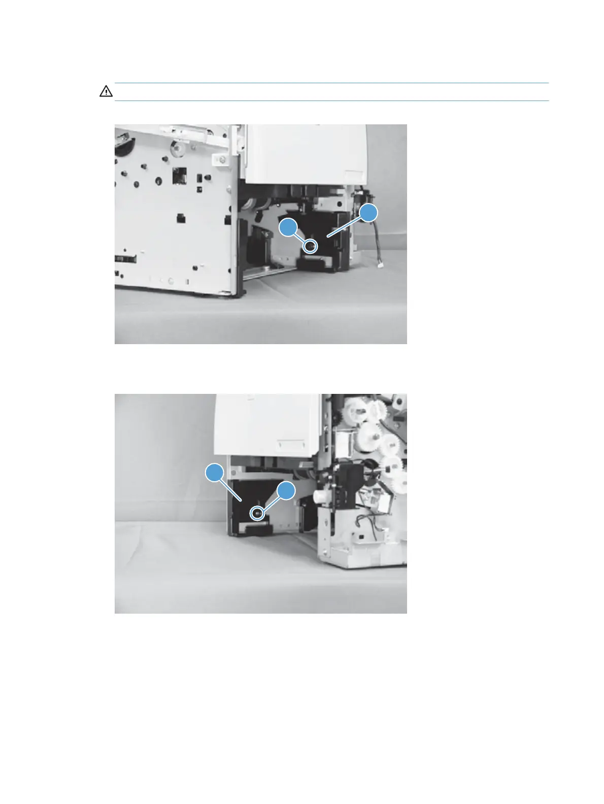 5. Remove one screw (callout 1), and then remove the left-side guide (callout 2).