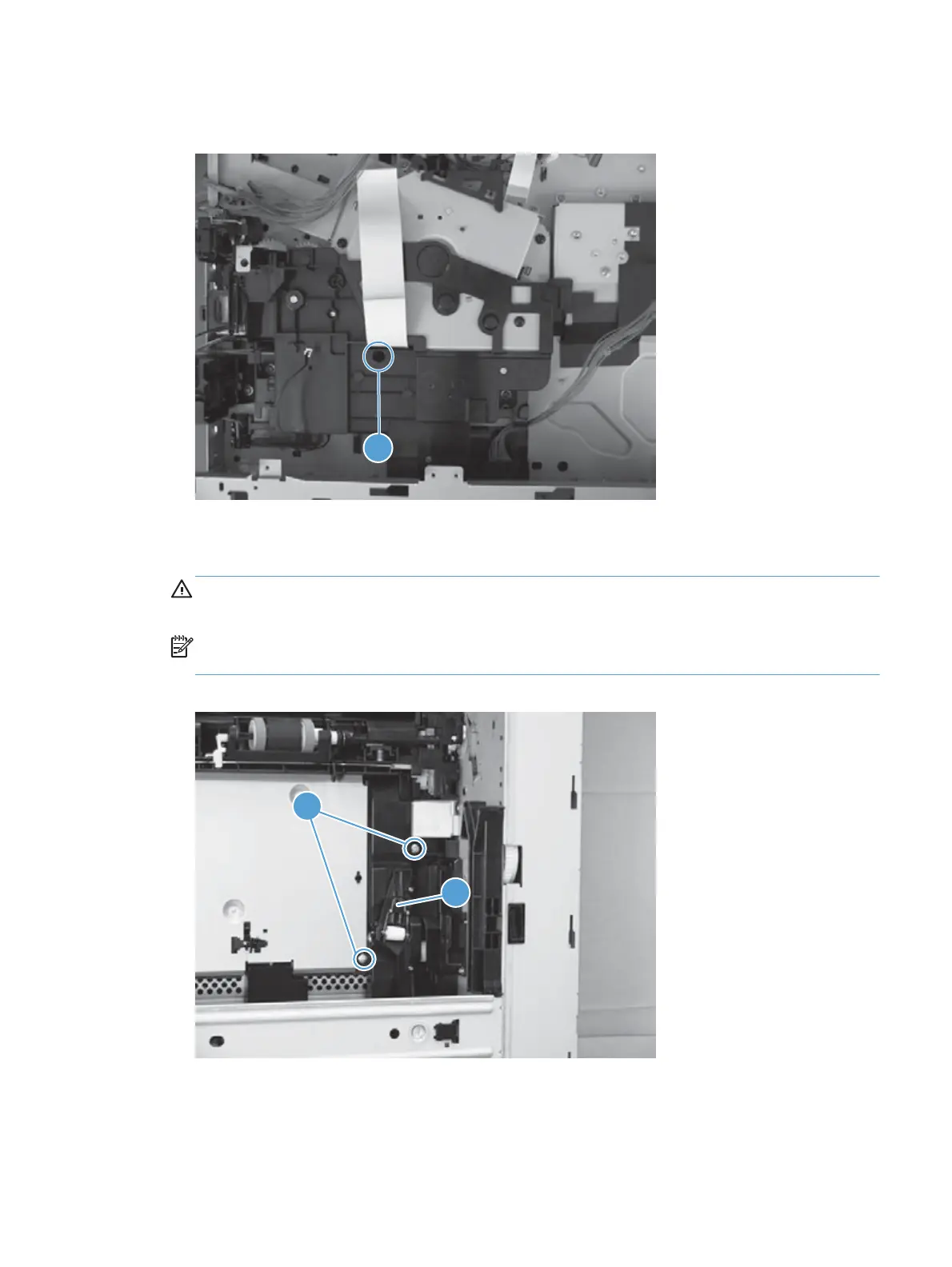 11. Place the product face-side up. Remove two screws (callout 1), and then remove the positioning