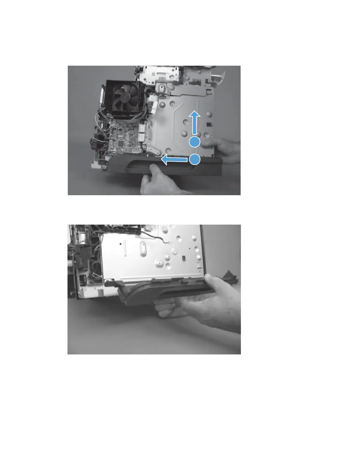 5. Raise the right side of the product (callout 1), slide the lower-right cover (callout 2) toward the front