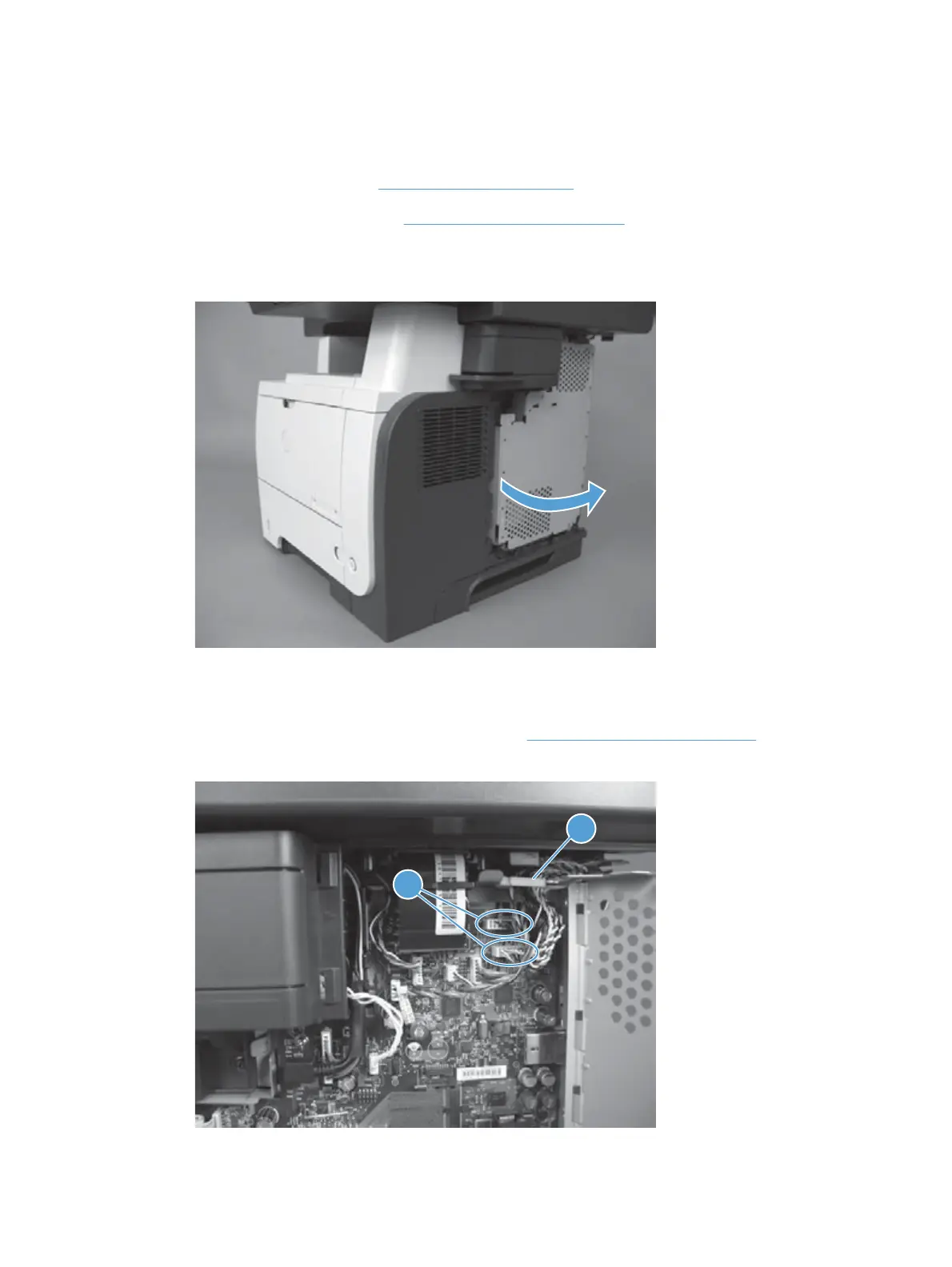 3. Disconnect two connectors (callout 1) from the formatter PCA and then release the wire harness