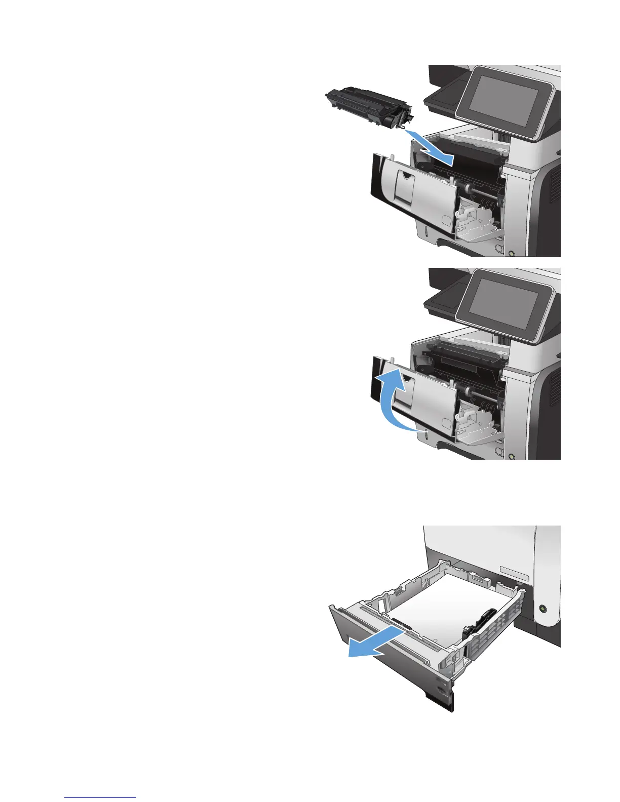 Clear jams in Tray 2 or an optional 500-sheet tray