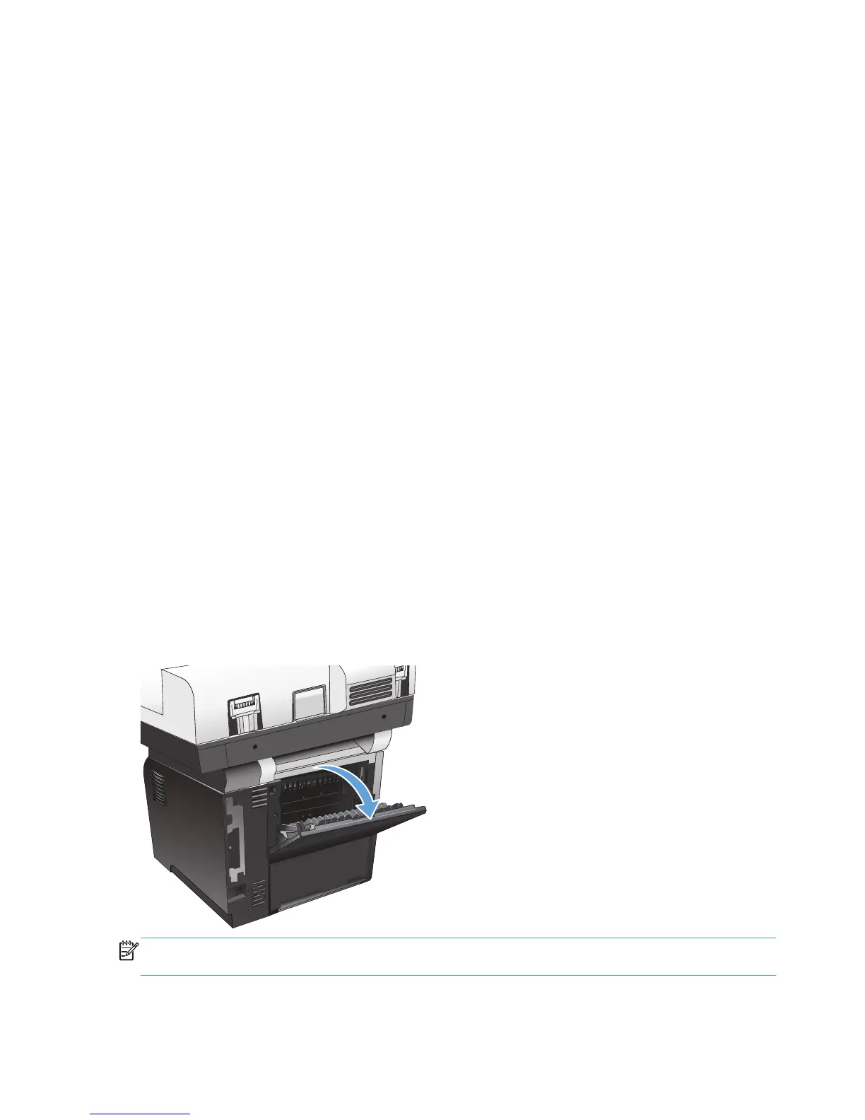 NOTE: Opening the rear output bin makes the duplexer and the top output bin unavailable. To avoid