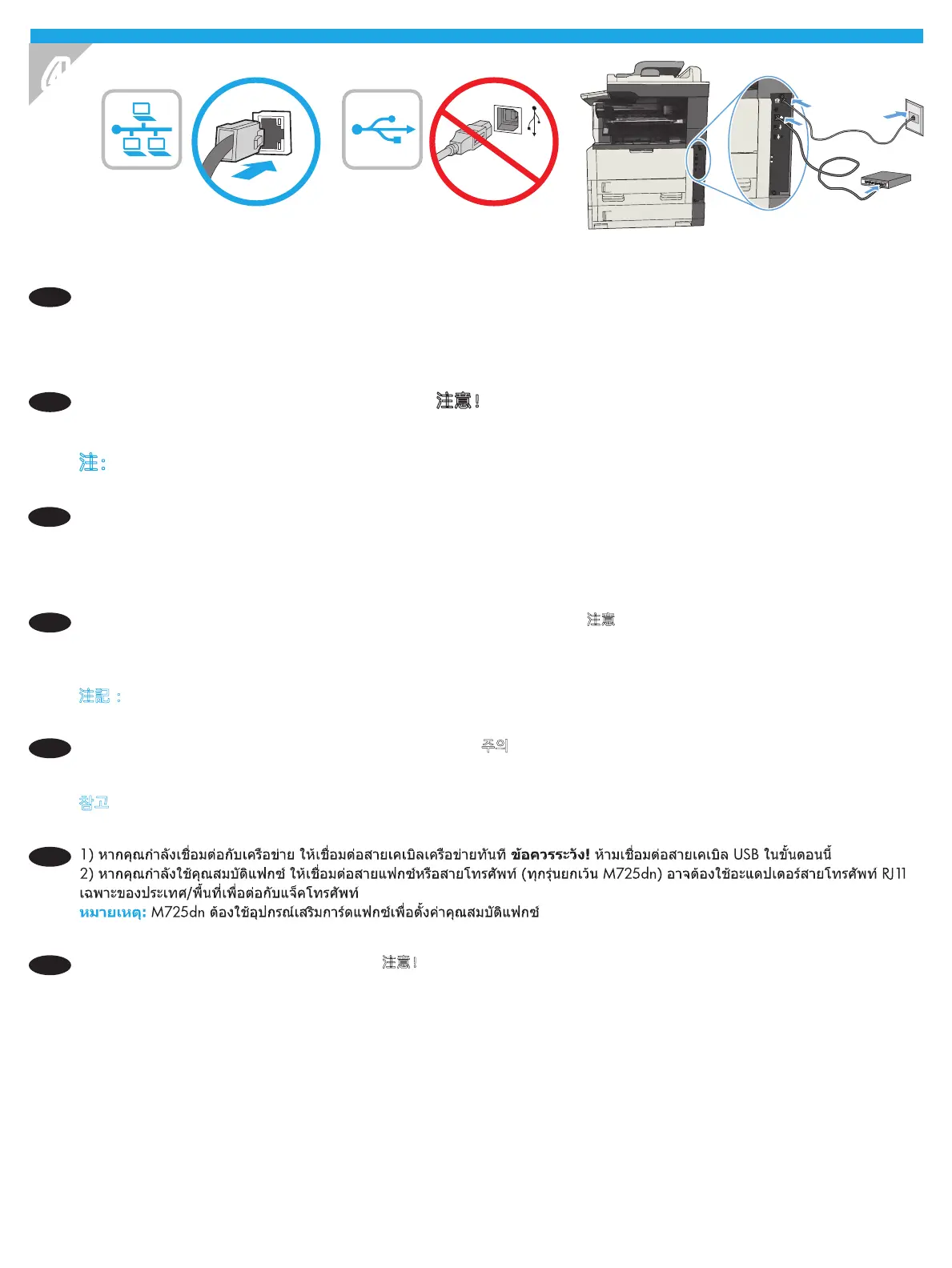 2) 如果您要使用傳真功能,請將傳真纜線連接至傳真線路或電話線路(M725dn 以外的所有機型)。可能需要有特定國家/地區適用的