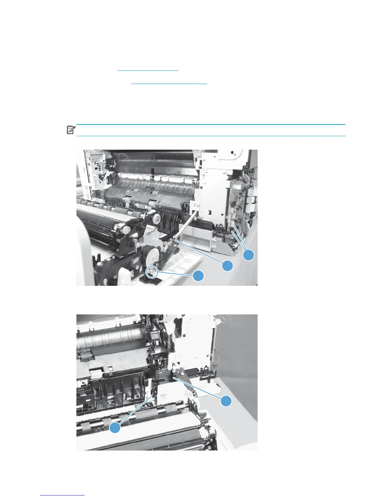 2. Remove one screw (callout 1), release the link arm (callout 2), and then disconnect two connectors