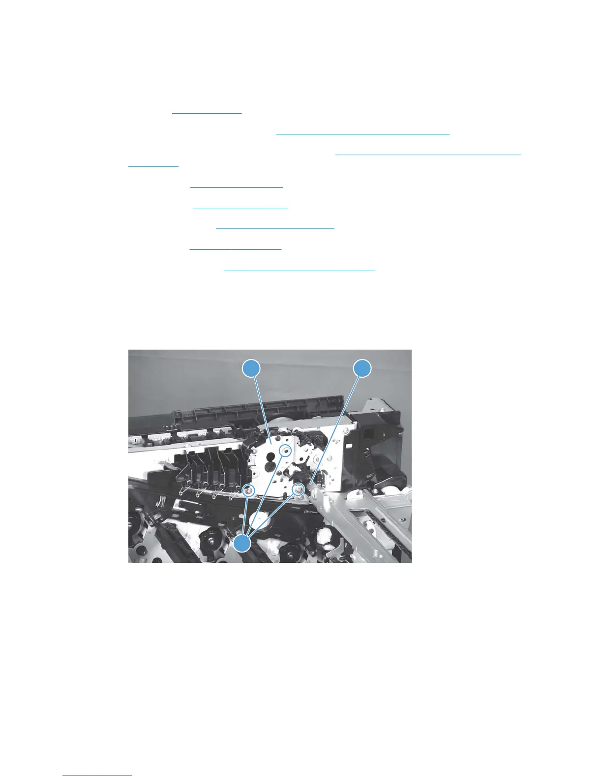 Remove three screws (callout 1), release one tab (callout 2), and then remove the delivery drive