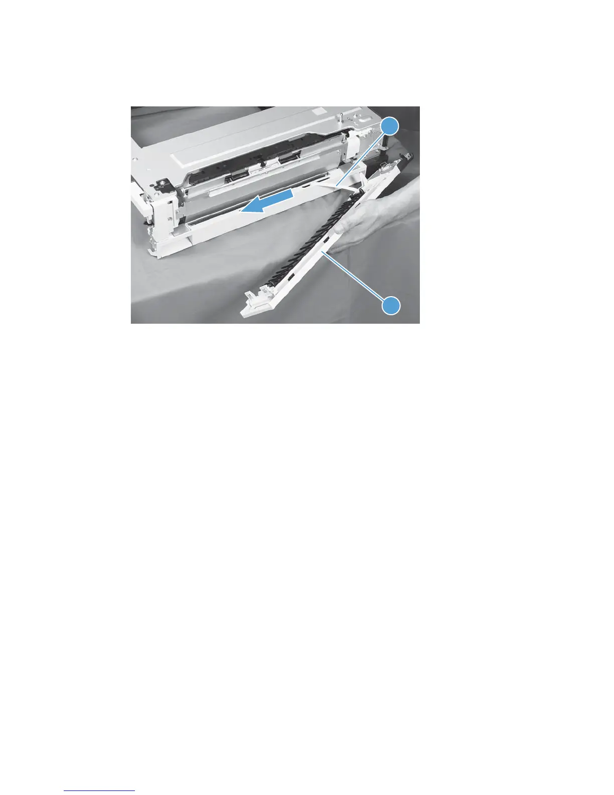 4. Slide the right door (callout 1) and the arm (callout 2) in the direction that the arrow indicates to remove
