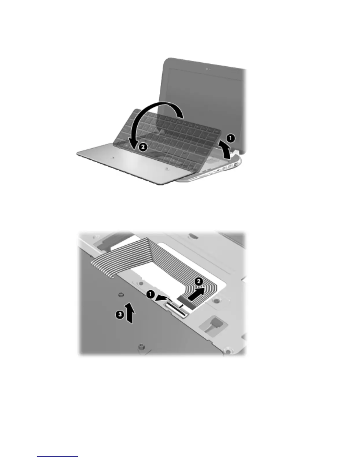 Lift the rear edge of the keyboard (1), and then swing the keyboard (2) up and forward until it