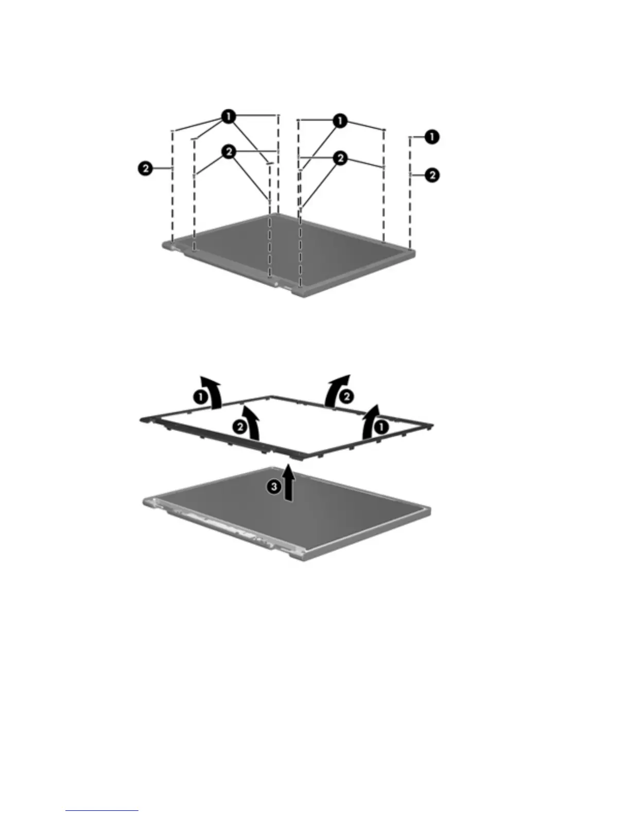 1. Remove all screw covers (1) and screws (2) that secure the display bezel to the display assembly.