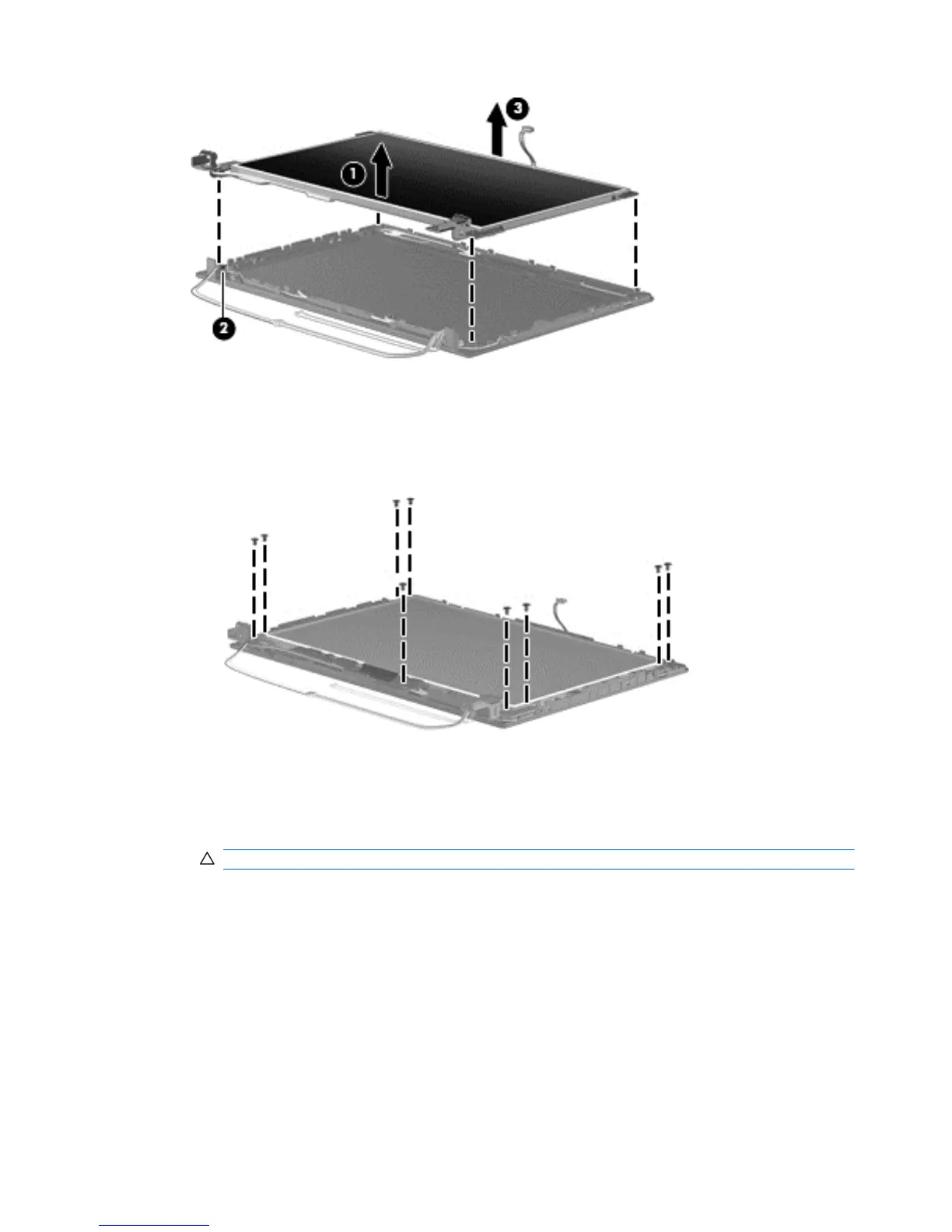 d. Disengage the touch-screen display board (3) from the snap hooks on the back cover.