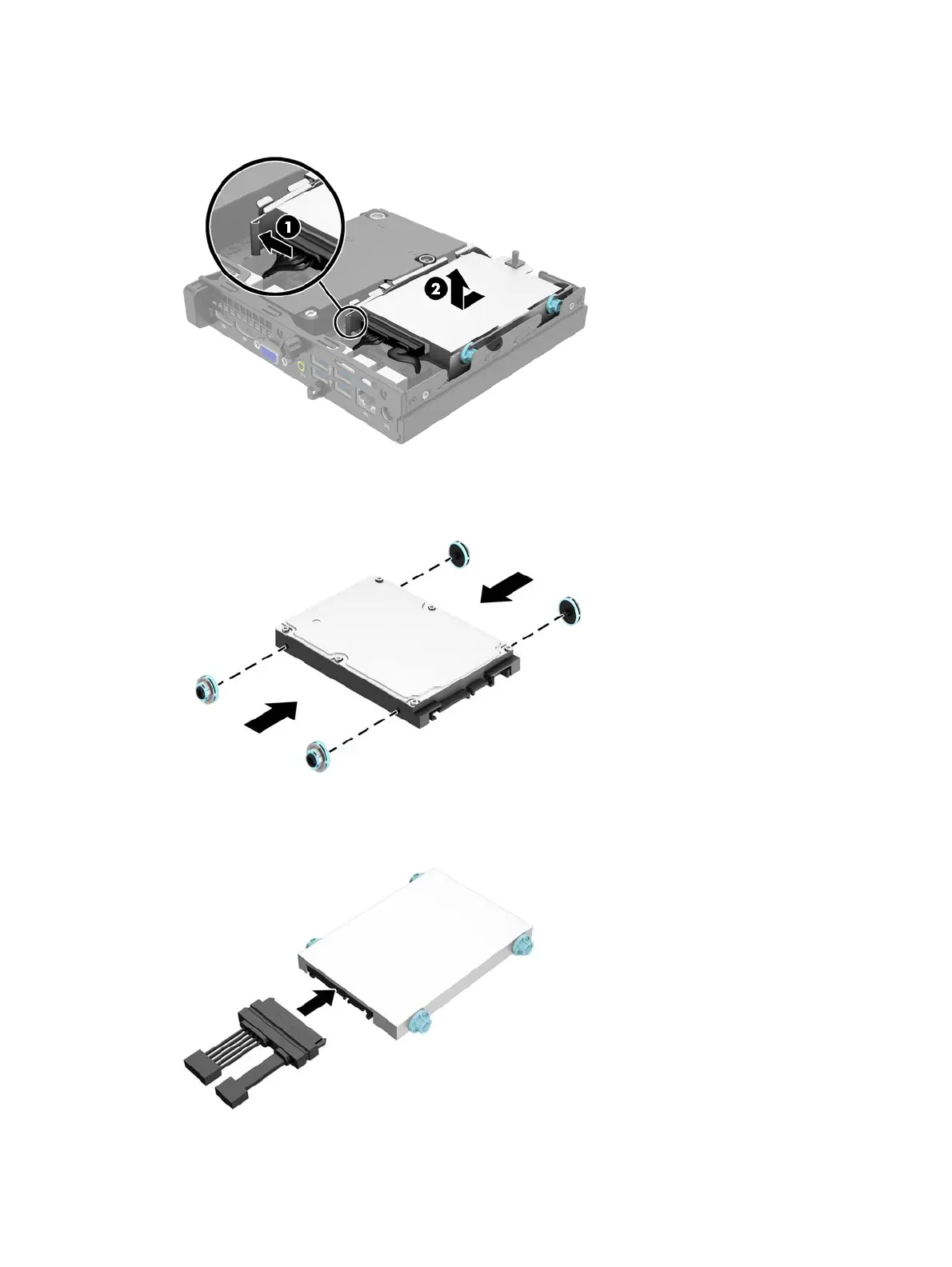 9. To install a hard drive, you must transfer the silver and blue isolation mounting guide screws from