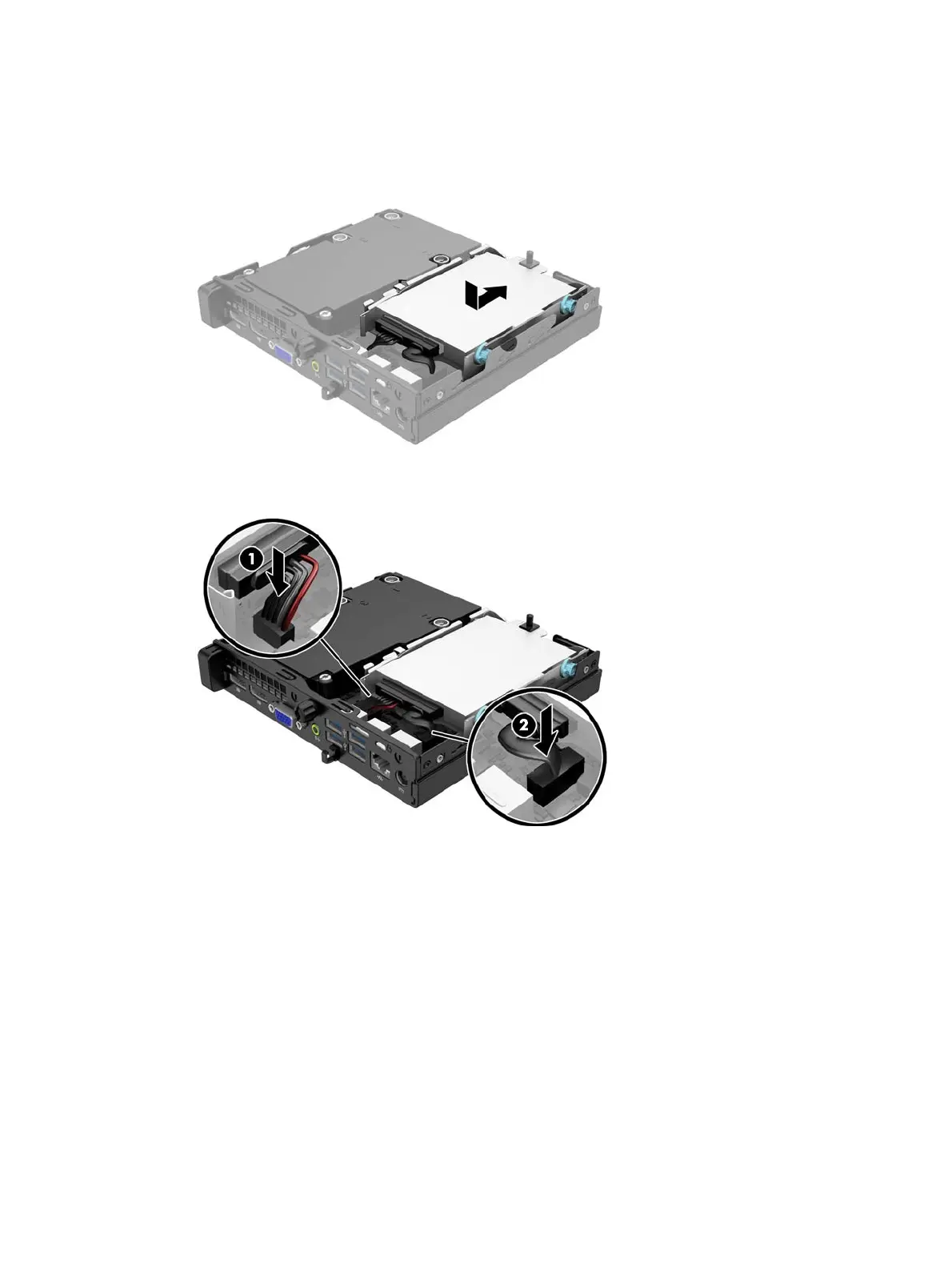 12. Connect the hard drive power cable (1) and data cable (2) to the system board.