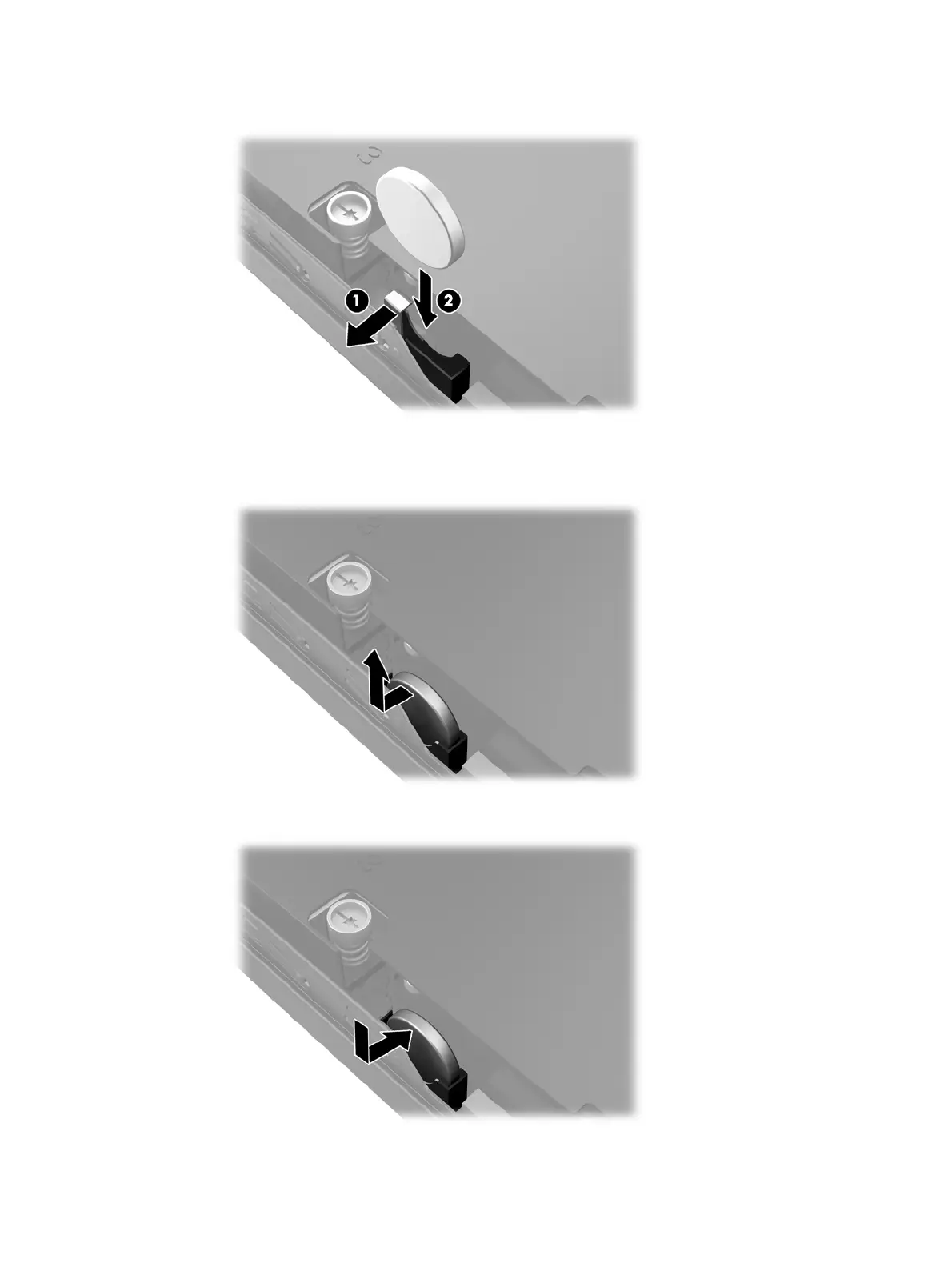 b. Pull back on the clip (1) and slide the replacement battery down into the holder (2).
