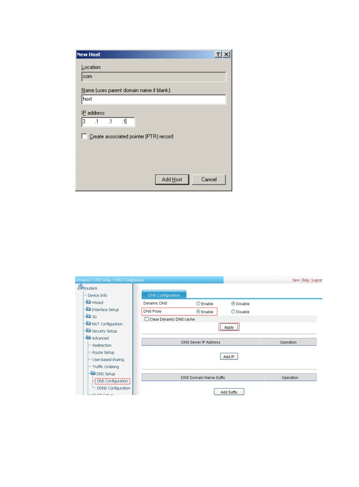 1. Enable DNS proxy on Router A: