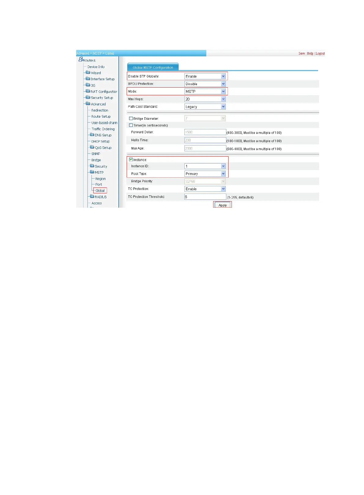 a. From the navigation tree, select Advanced > MSTP > Global.