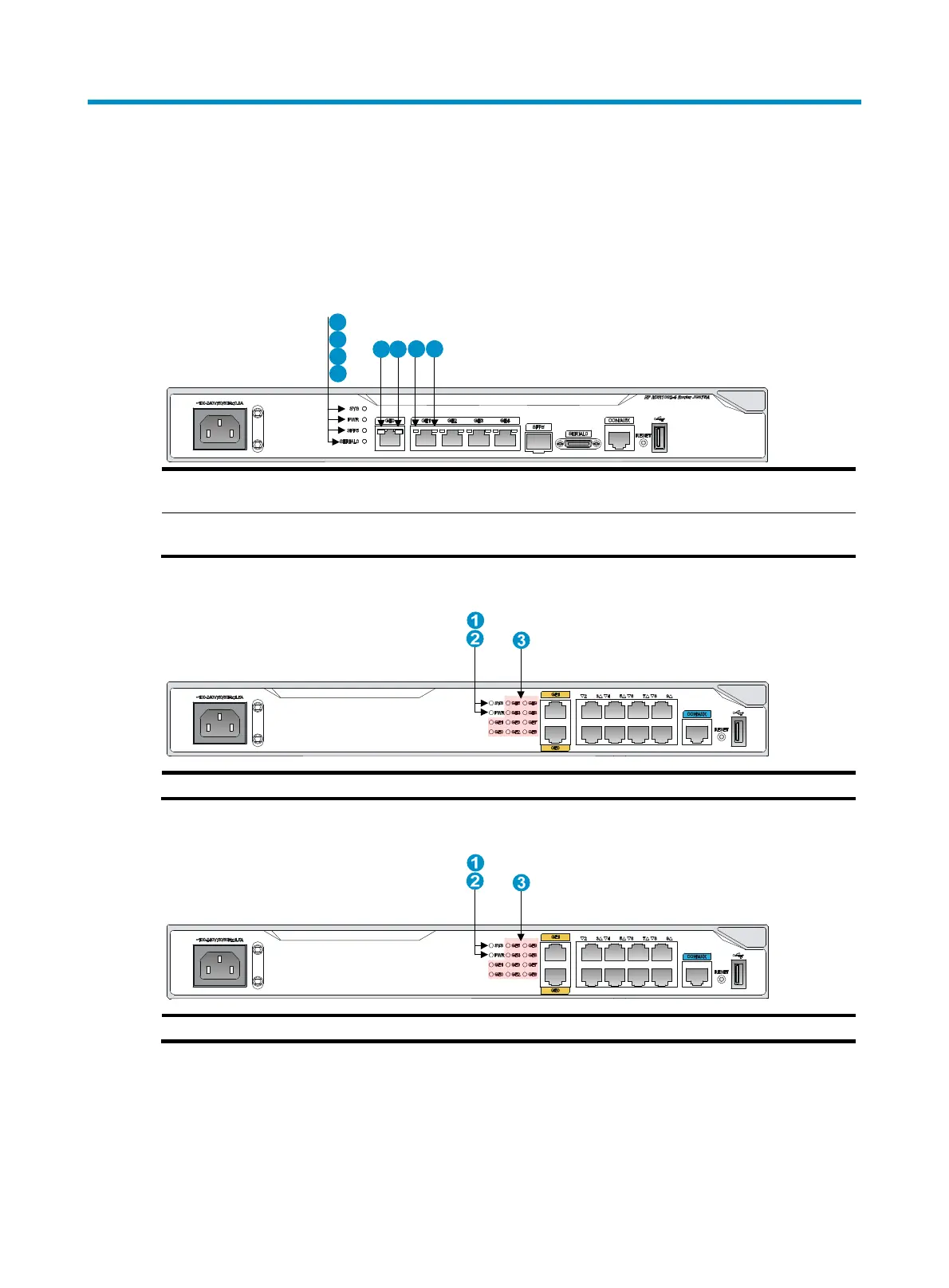 (1) System LED (SYS) (2) Power supply LED (PWR) (3) Gigabit Ethernet port LEDs (GE0 to GE9)