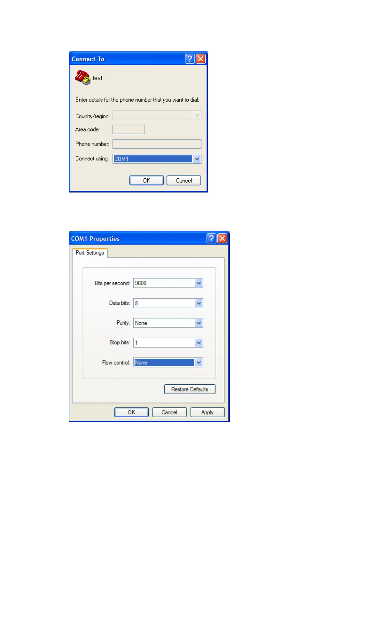 3. Set Bits per second to 9600, Data bits to 8, Parity to None, Stop bits to 1, and Flow control to