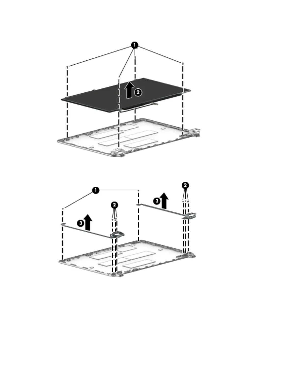 6. Remove 4 screws from the display panel (1), and then remove it (2).