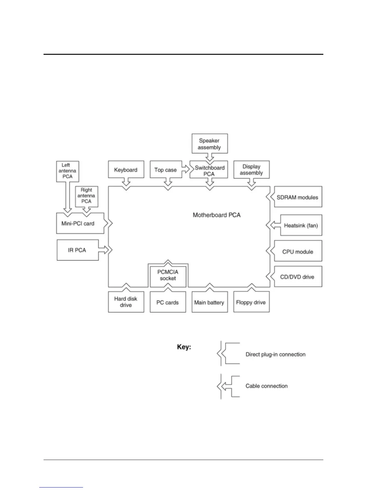 The following figure shows the connections among the notebook’s replaceable electronic modules.