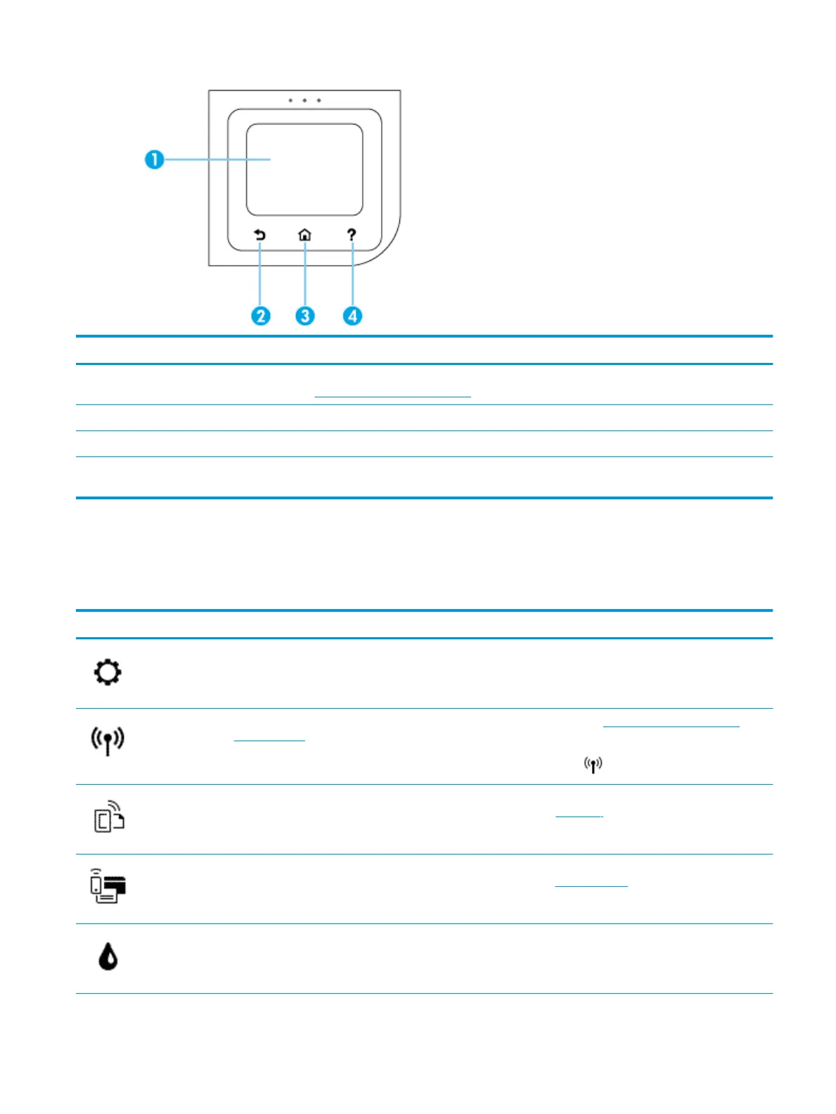 Wireless: Displays wireless status and menu options. For more information, see Set up the printer for wireless