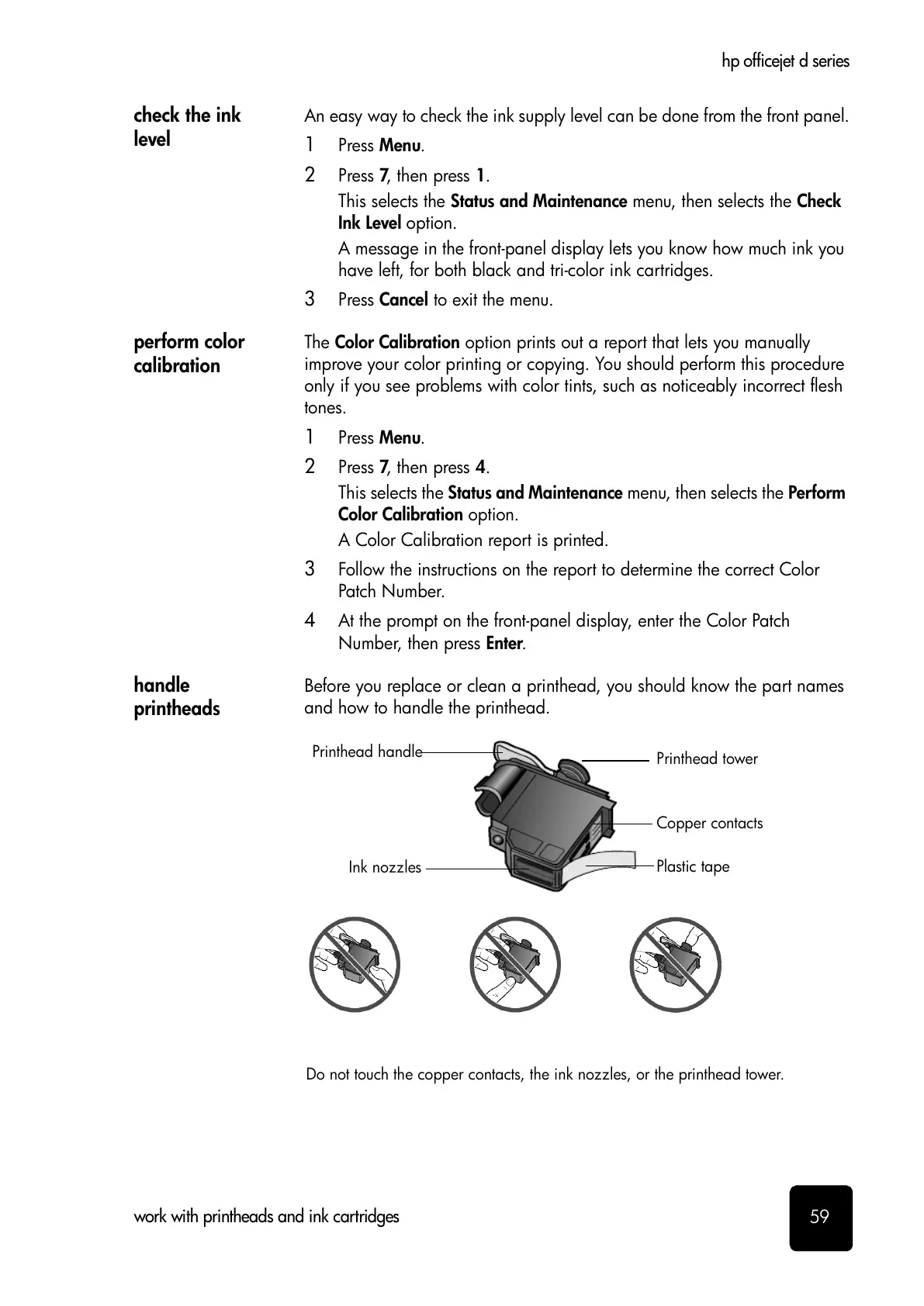 Do not touch the copper contacts, the ink nozzles, or the printhead tower.