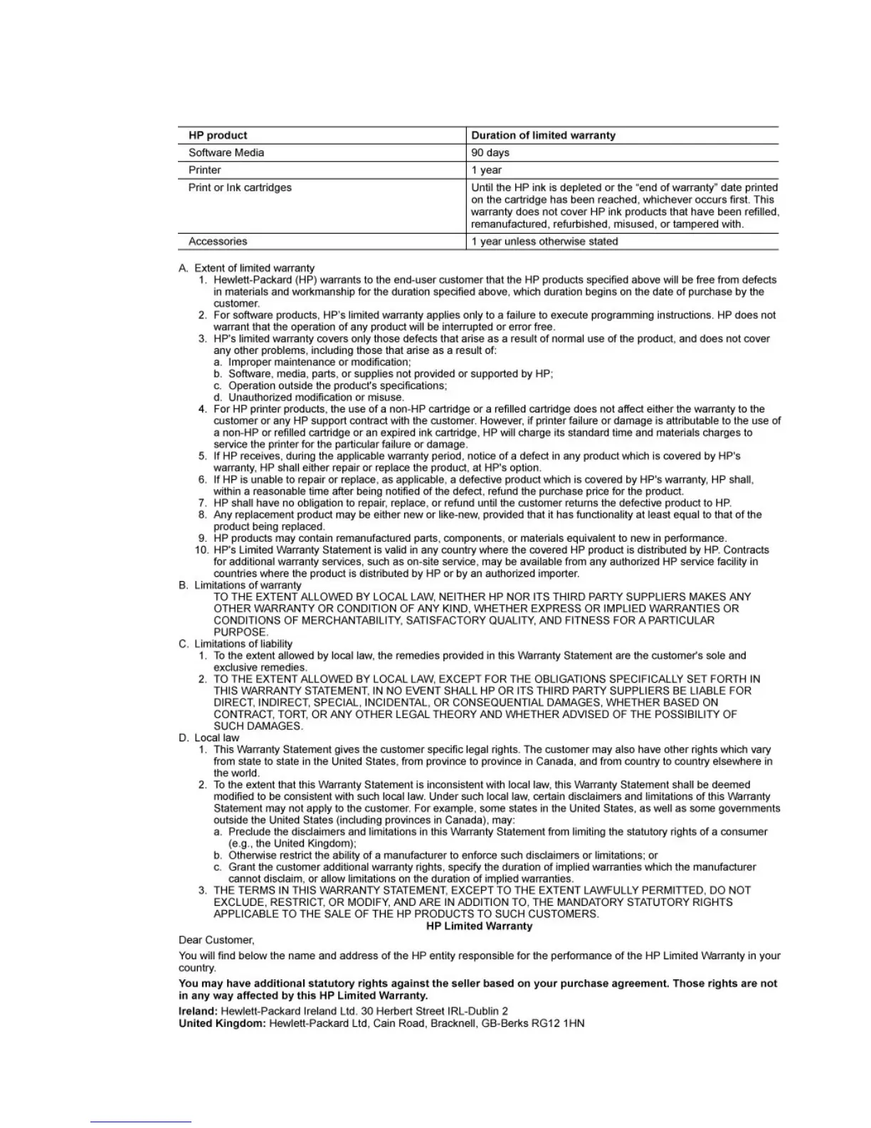 Hewlett-Packard limited warranty statement