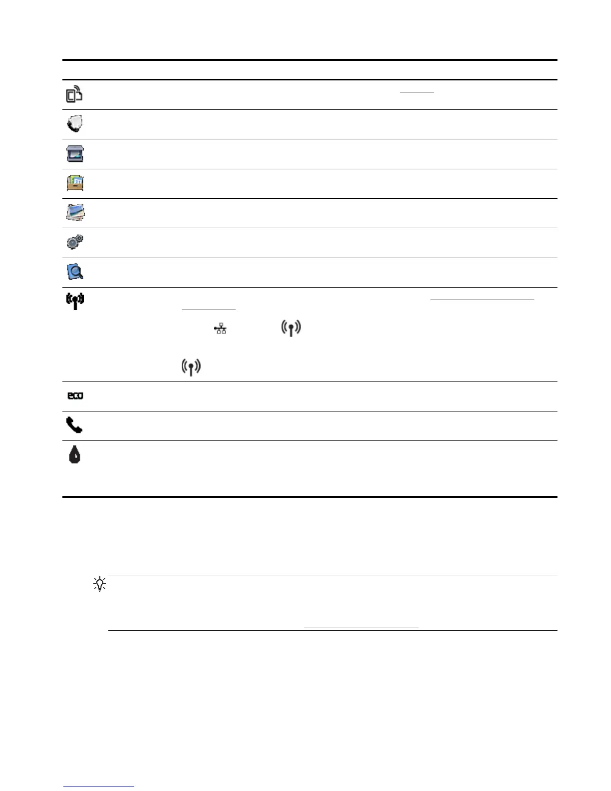 Displays wireless status and menu options. For more information, see Set up the printer for wireless