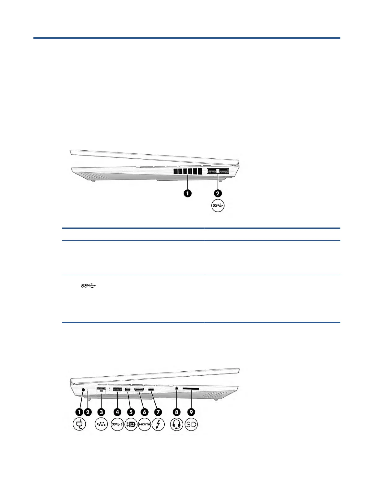 (2) USB SuperSpeed ports (2) Connect a USB device, provide high-speed data transfer, and (for