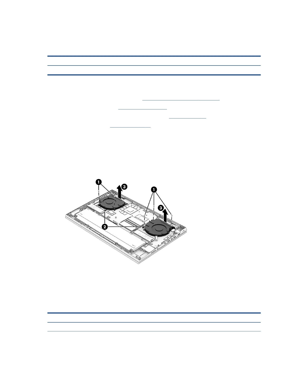 1. Remove the two Phillips M2.0 × 3.0 screws (1) from the left fan and three Phillips M2.0 × 5.0 screws (1)