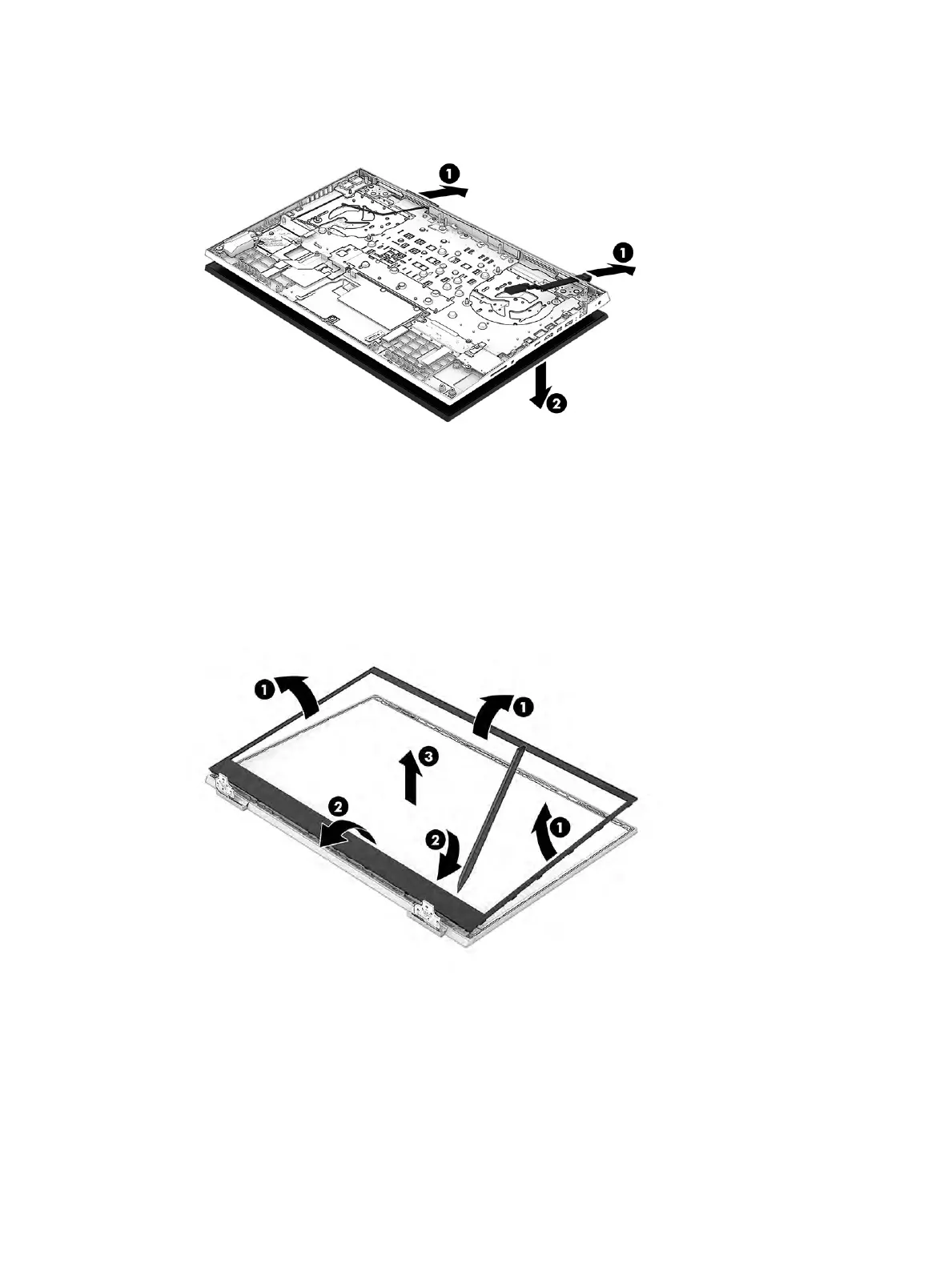 b. Run a tool along the bottom edge of the bezel to release it from the display assembly (2).