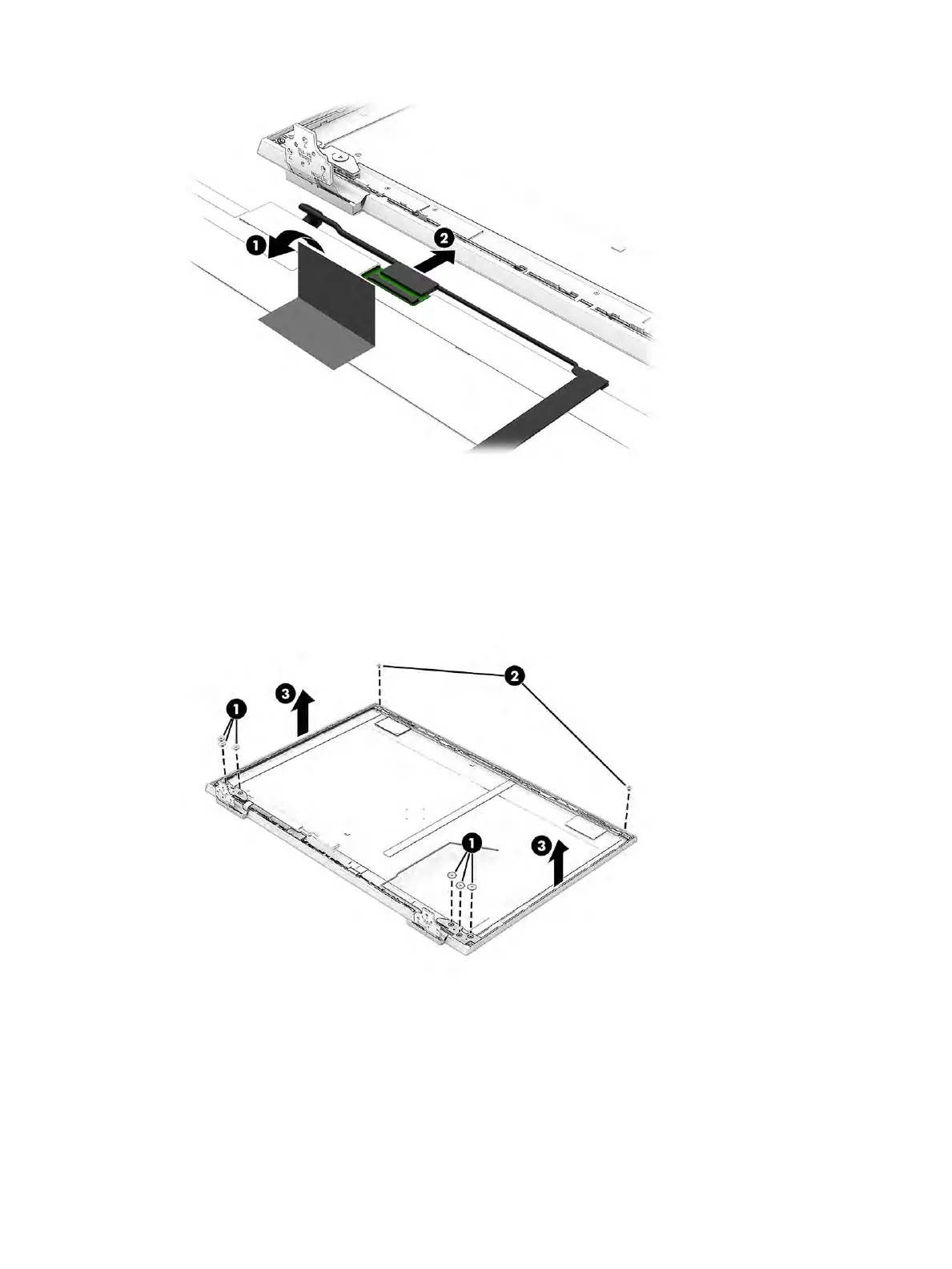 b. Remove the Phillips M2.0 × 3.0 screw (2) from the top of each hinge.