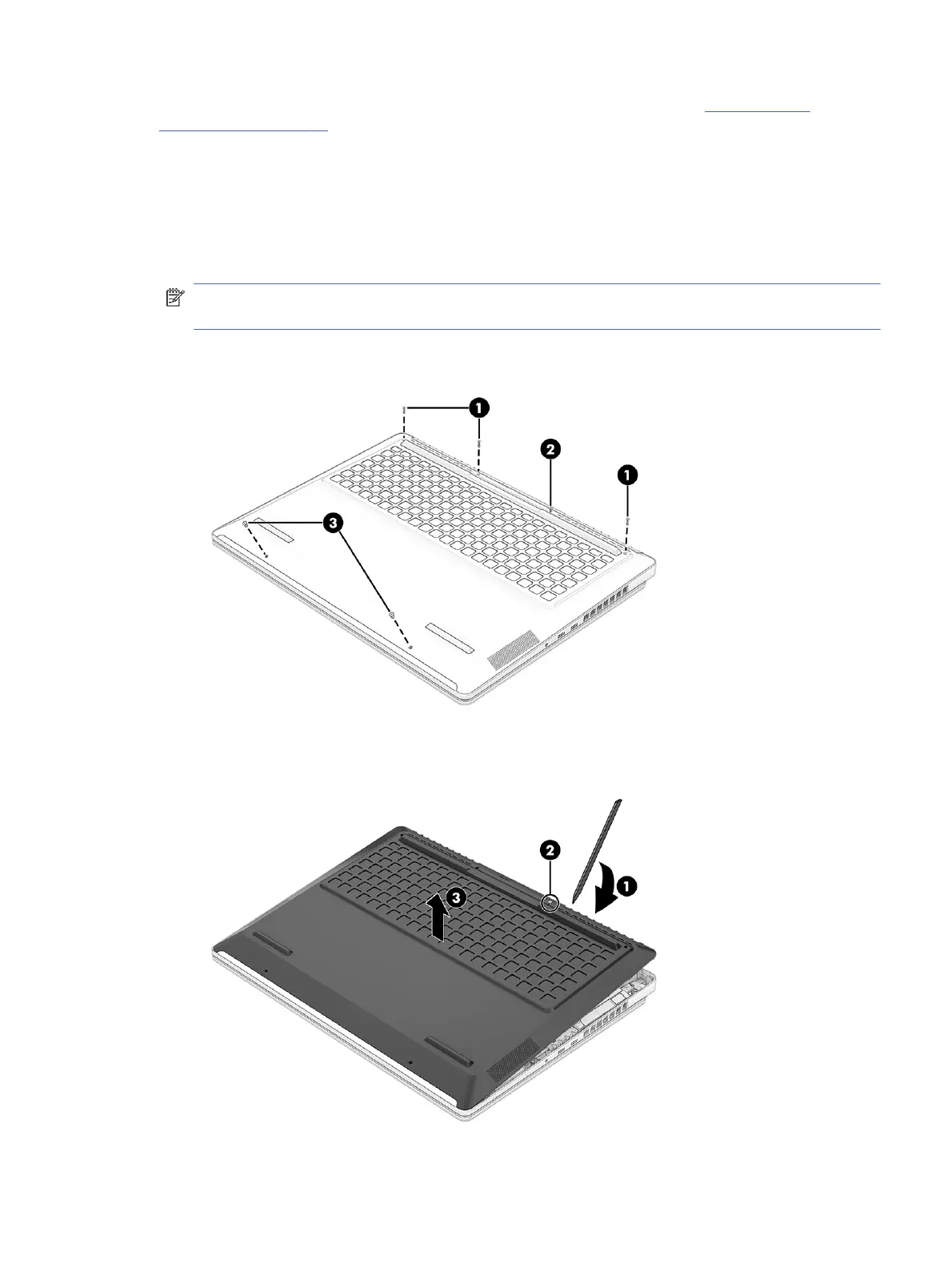 5. Insert a tool (1) into the seam near the captive screw (2), and then release the bottom cover (3).