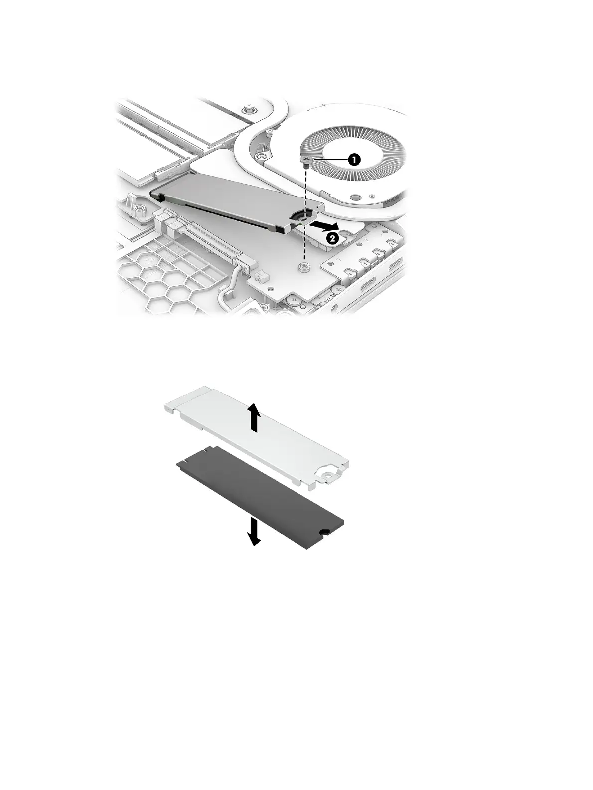1. Secondary SSD: Remove the Phillips screw (1) from the SSD cover, and then pull the cover (2) with