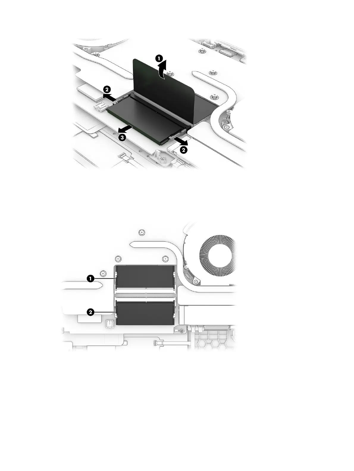 When installing memory modules, install the top module (1) upside down. Install the bottom module (2)
