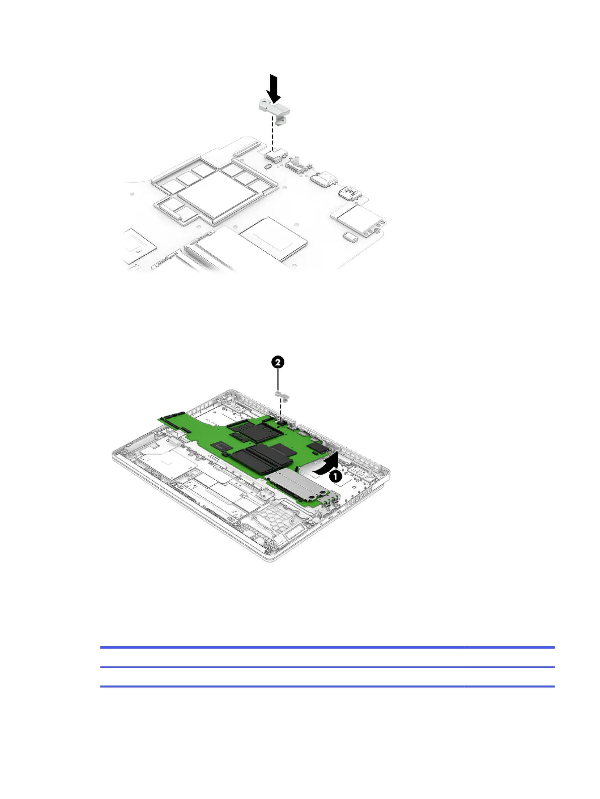 When installing a system board, insert the top of the system board (1) under the plastic lip at the top of