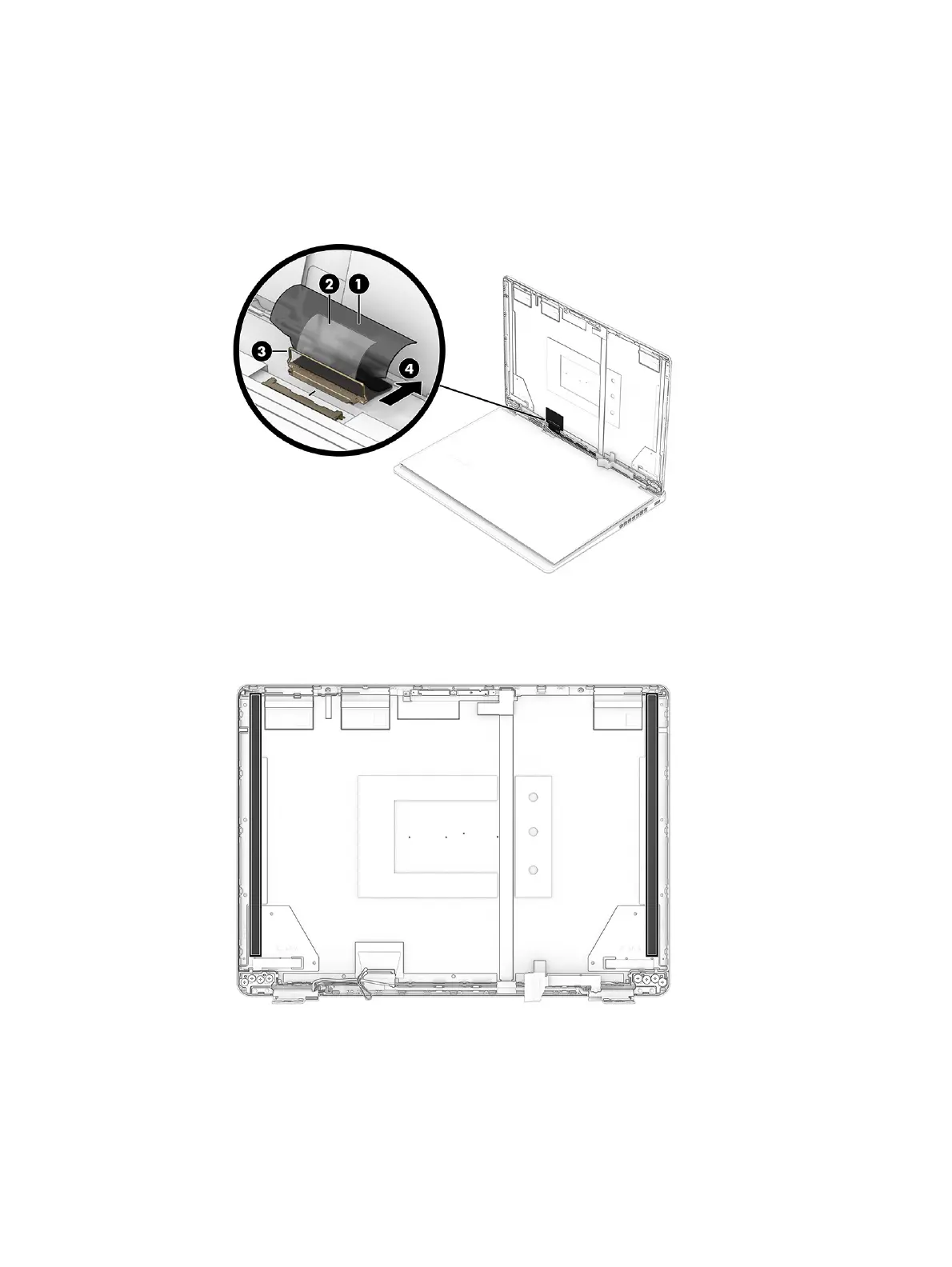 e. Peel the tape (2) off the connector on the back of the display panel.