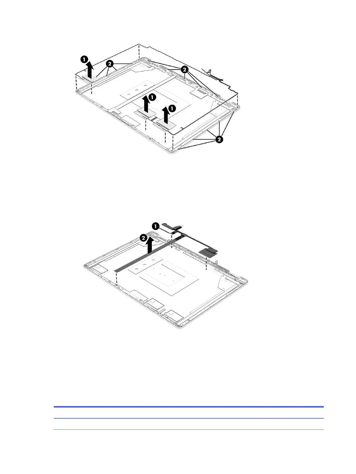 Remove the cable from the tape (1) at the bottom of the display, and then peel the cable (2) off