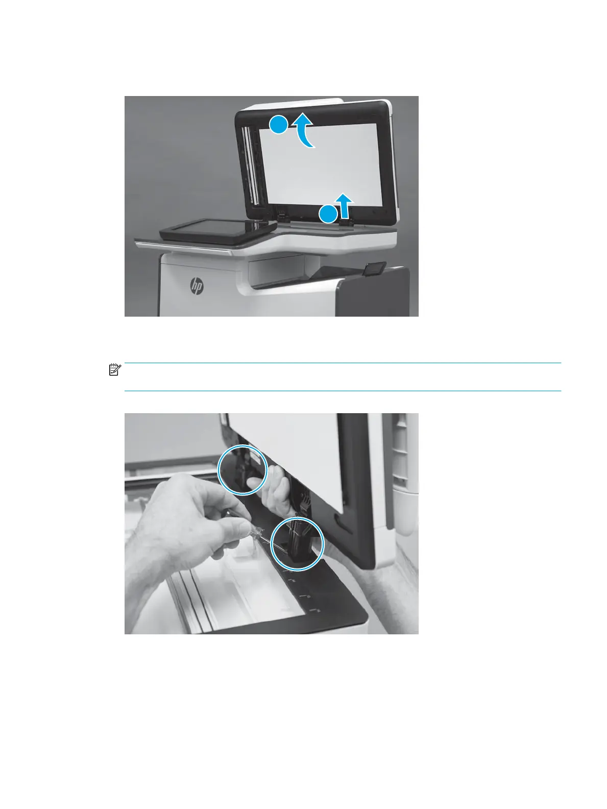 4. Support the document feeder, and then use a small, at-blade screwdriver to release two tabs on the