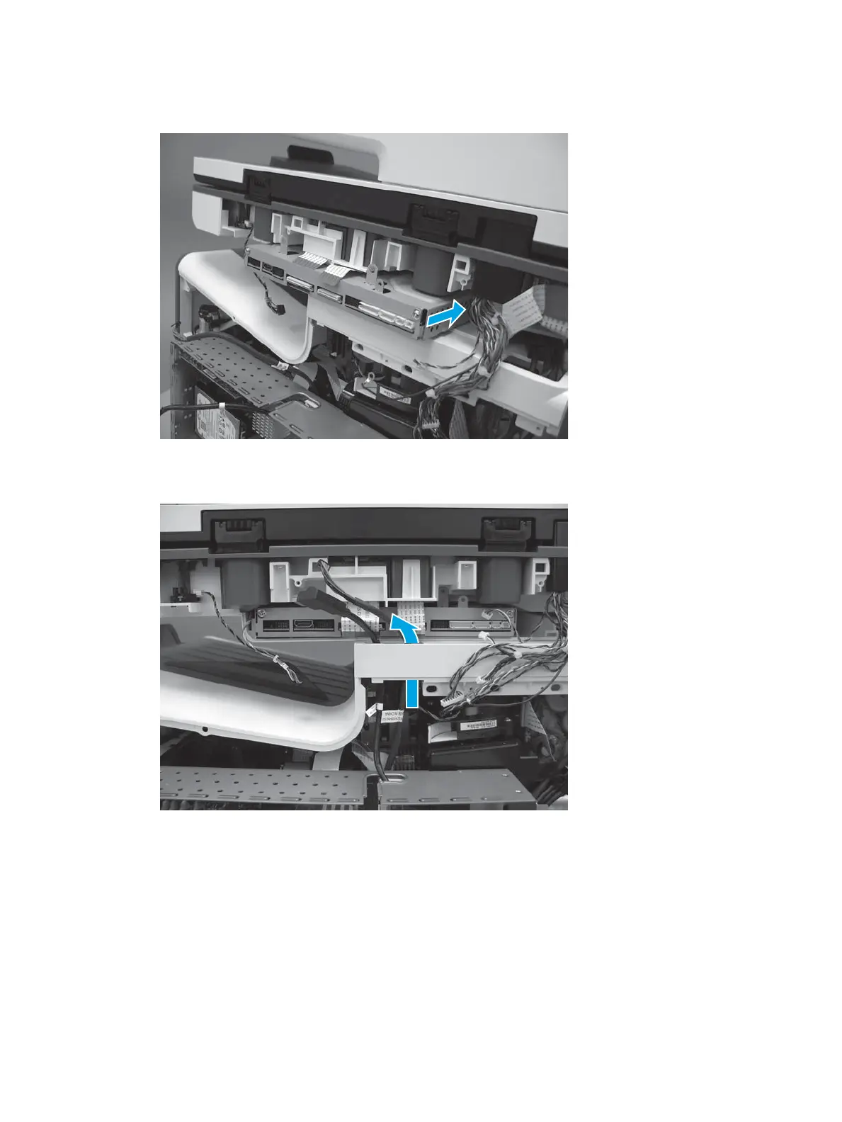 3. Install two black cables up through the opening in the printer cover.