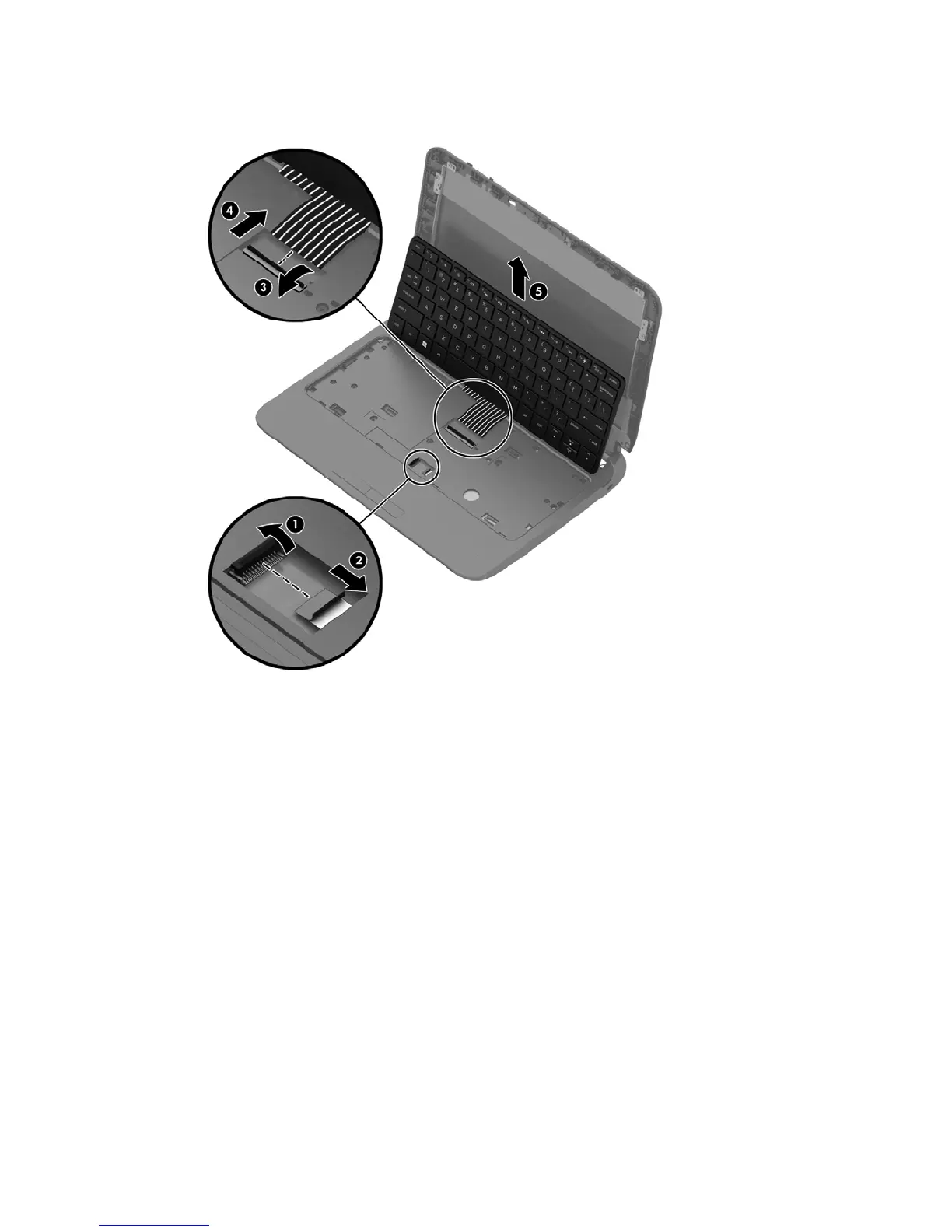 5. Slide the keyboard cable ZIF connector (3) and slide the disconnected cable (4). Lift the